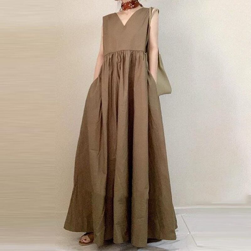 2カラー ノースリーブ Vネック Aライン ハイウエスト ロングワンピース *on119