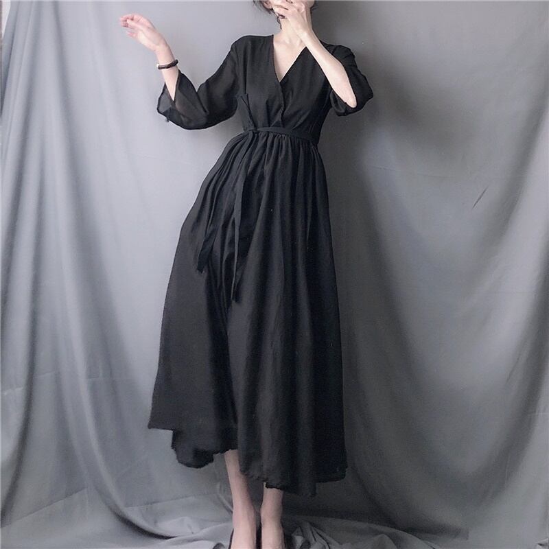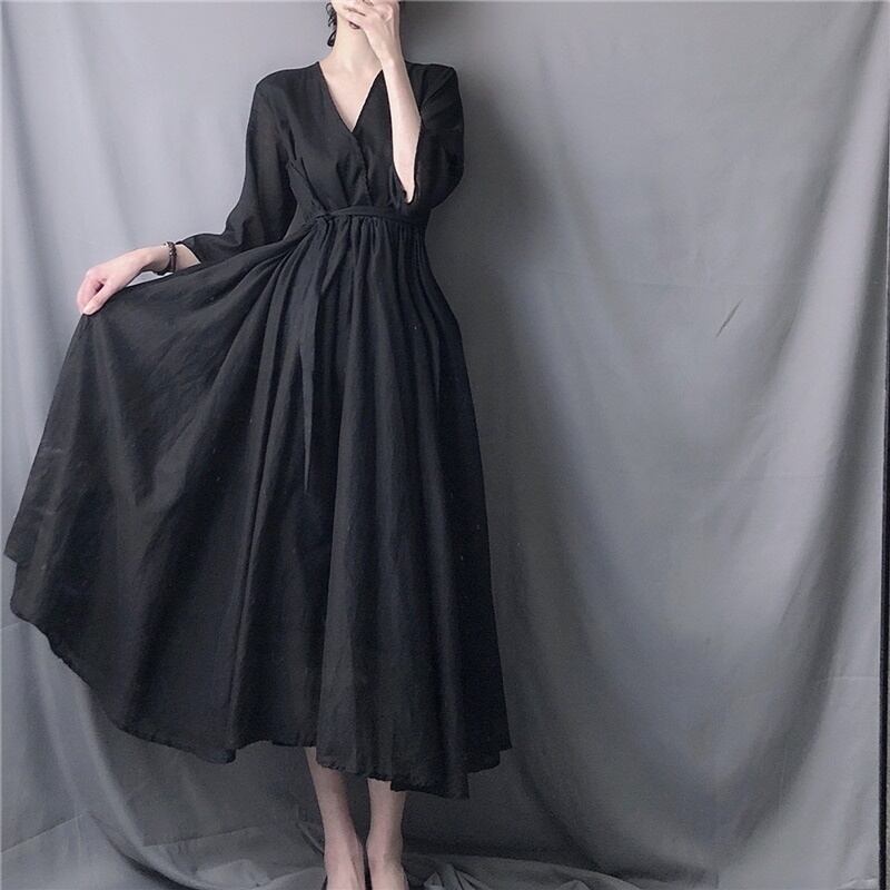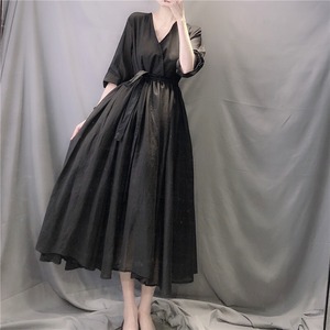 2カラー レトロ フレンチ プルオーバー ハイウエスト Vネック ロングワンピース *on121