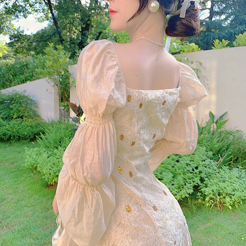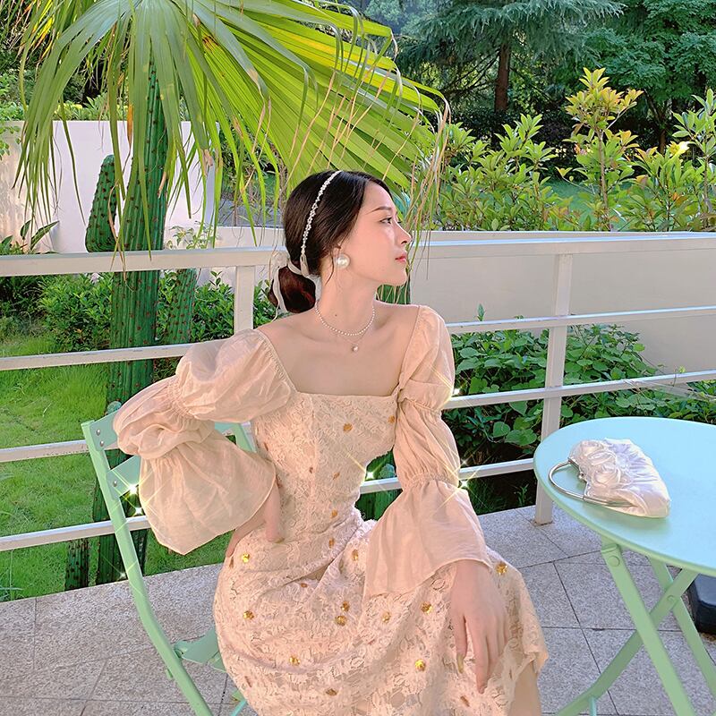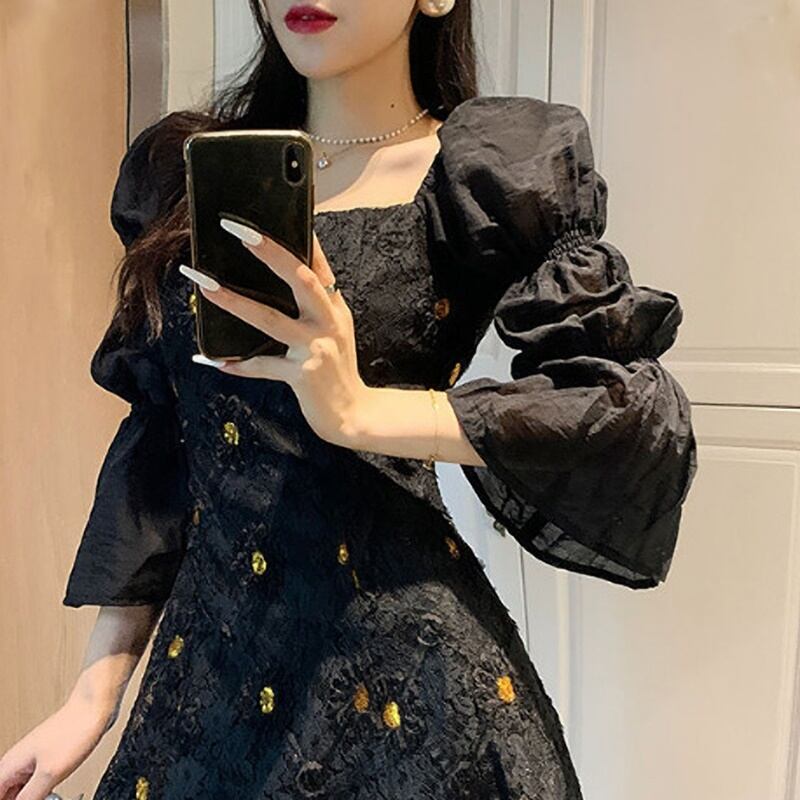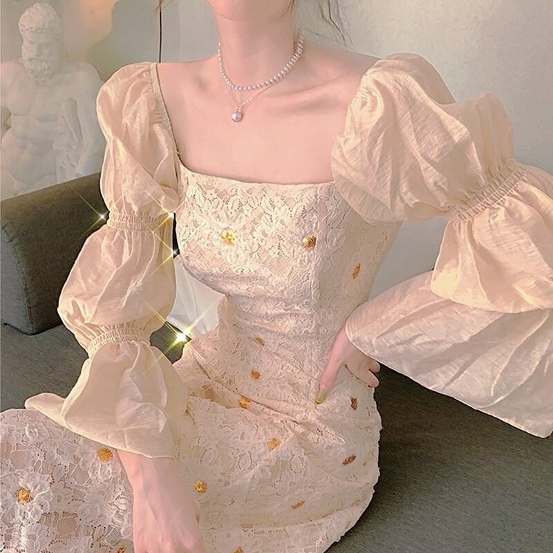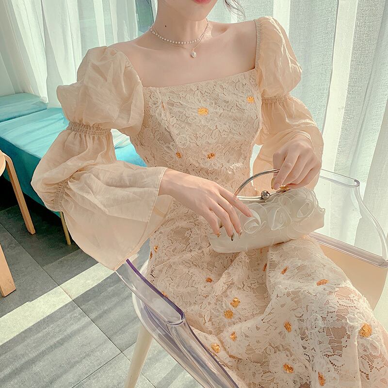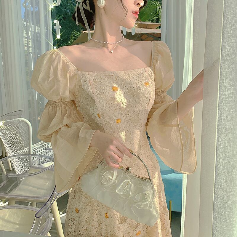 2カラー レトロ 花柄 レース フェミニン パフスリーブ 長袖 ドレス ワンピース *on127