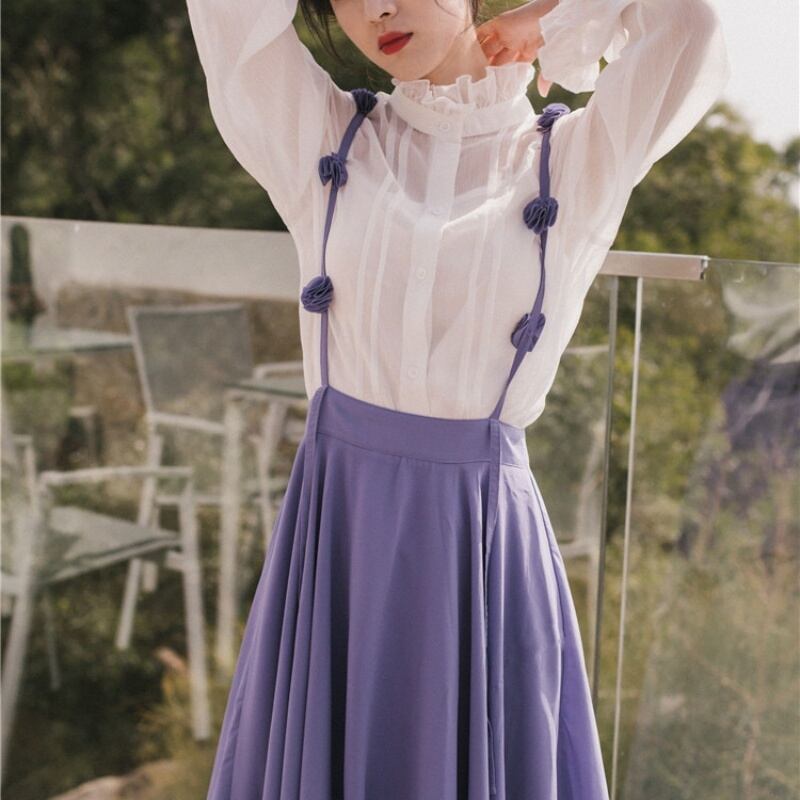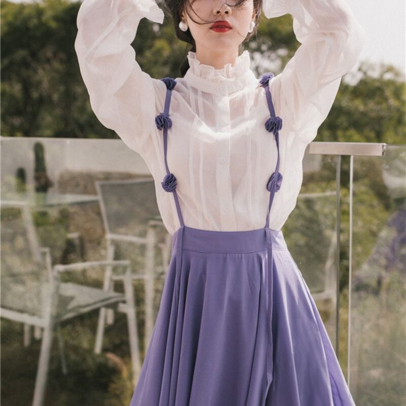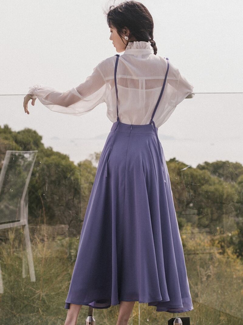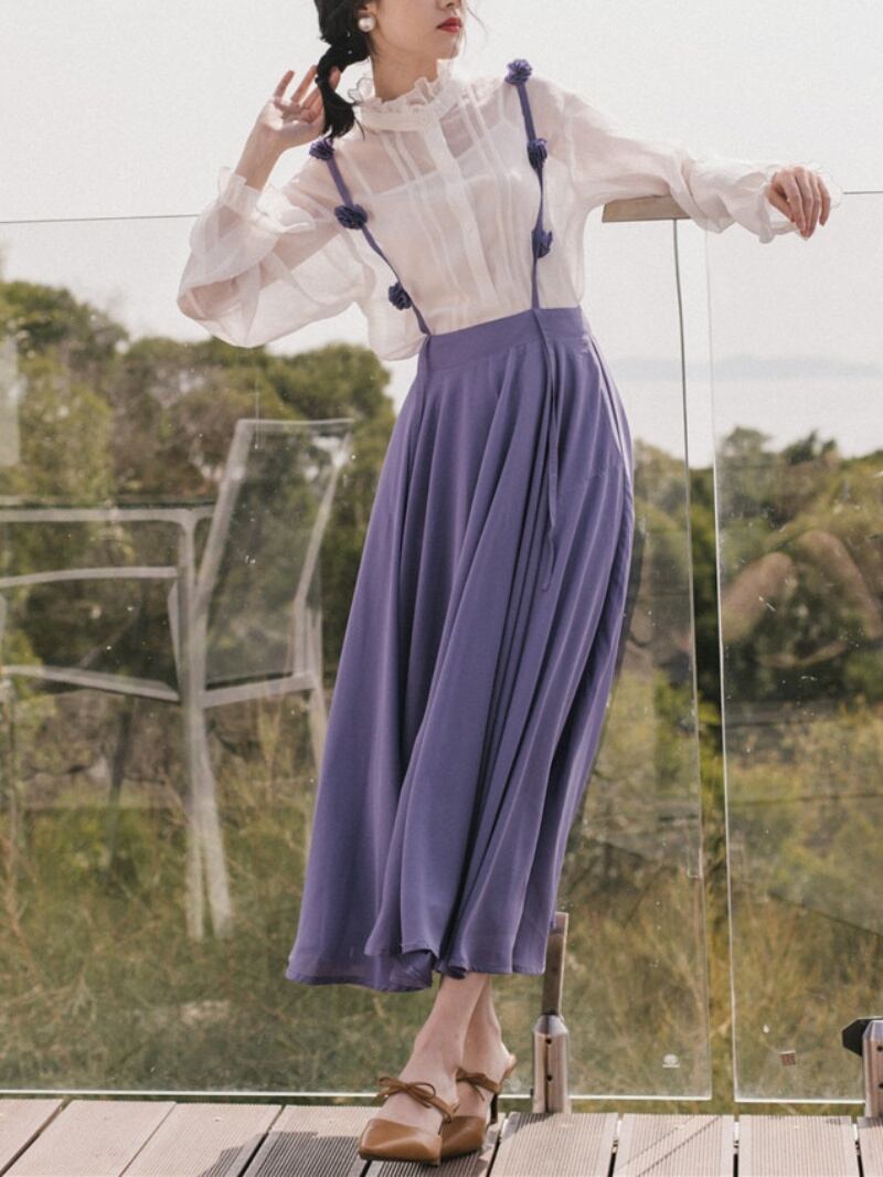 鮮やかなパープルが目を引くロングスカートに、ふんわりエレガントな透け感のあるブラウスを合わせたセット商品です。