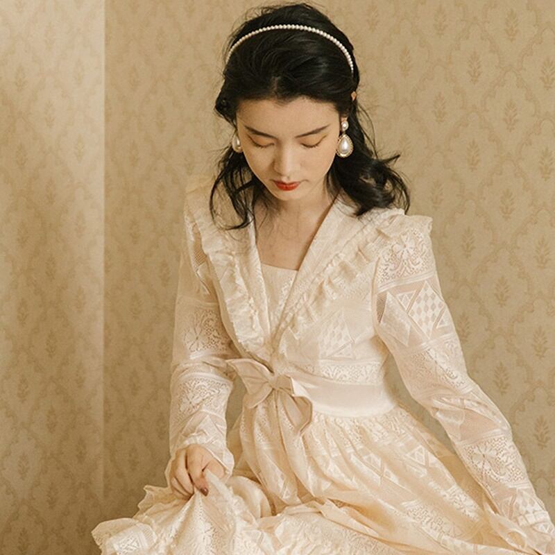 シアー素材で全体にレトロな模様の入ったロマンティックなドレス。