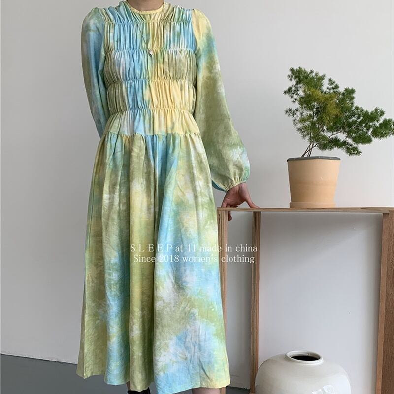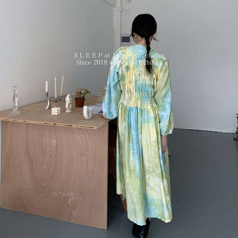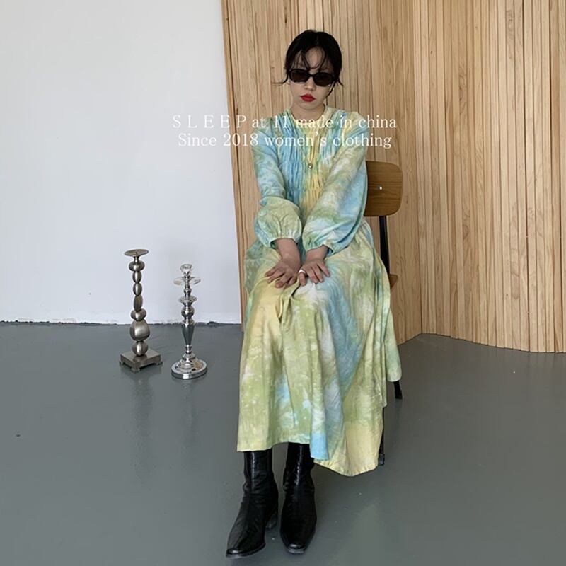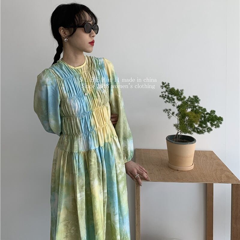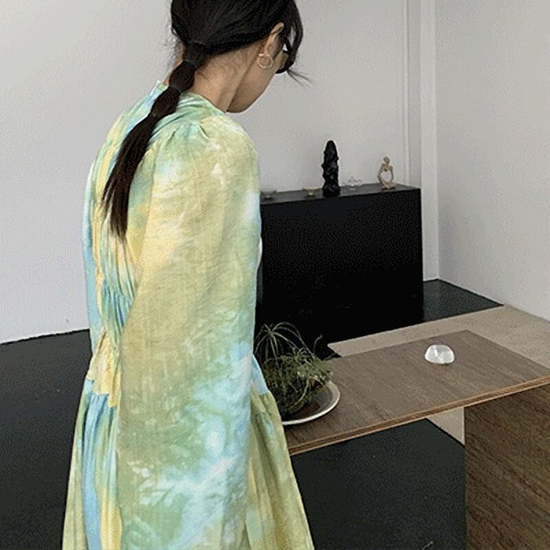 絞り染風 プリント ギャザー ラウンドネック ロングワンピース *on138