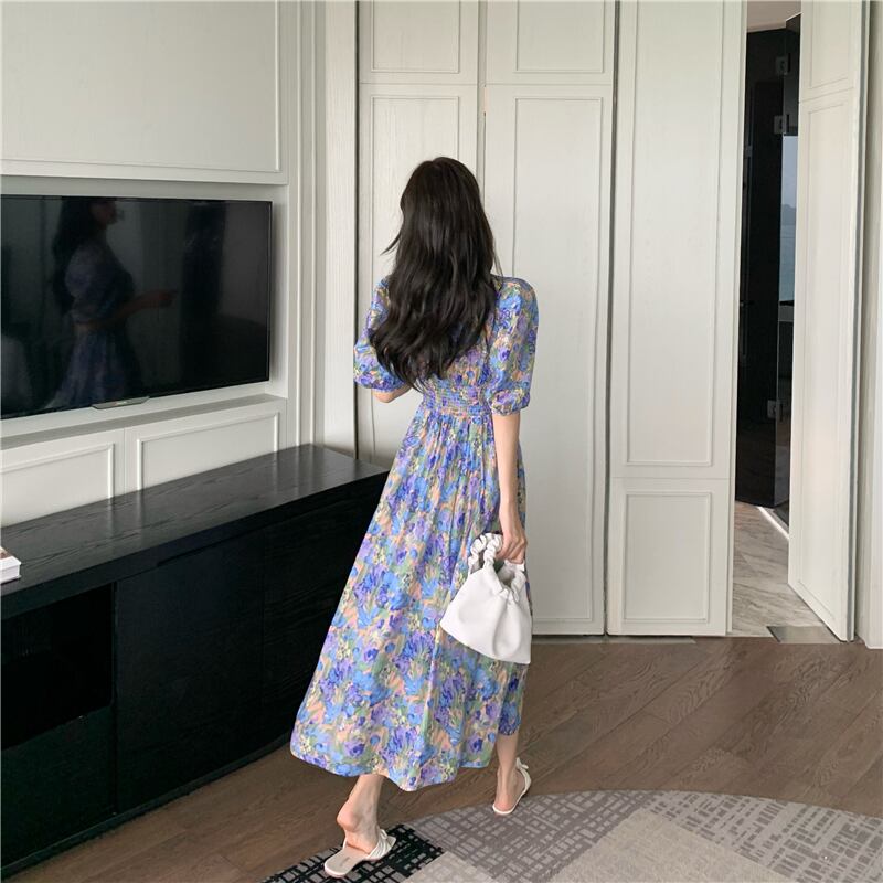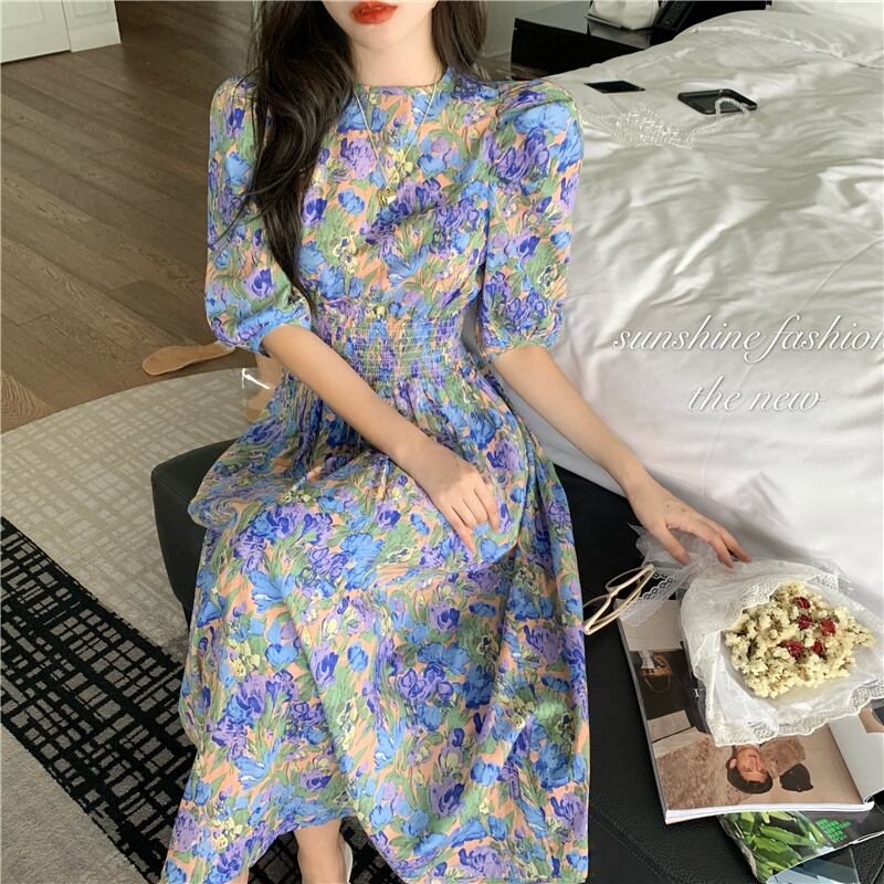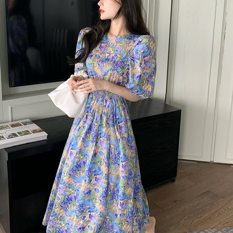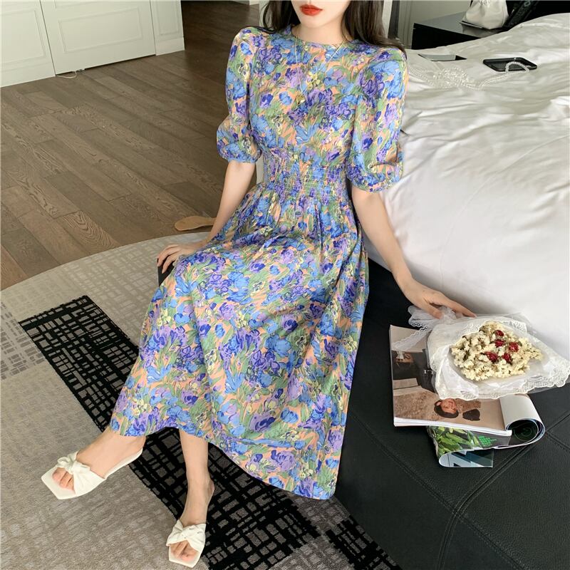 フローラル プリント パフスリーブ Aライン ワンピース *on141
