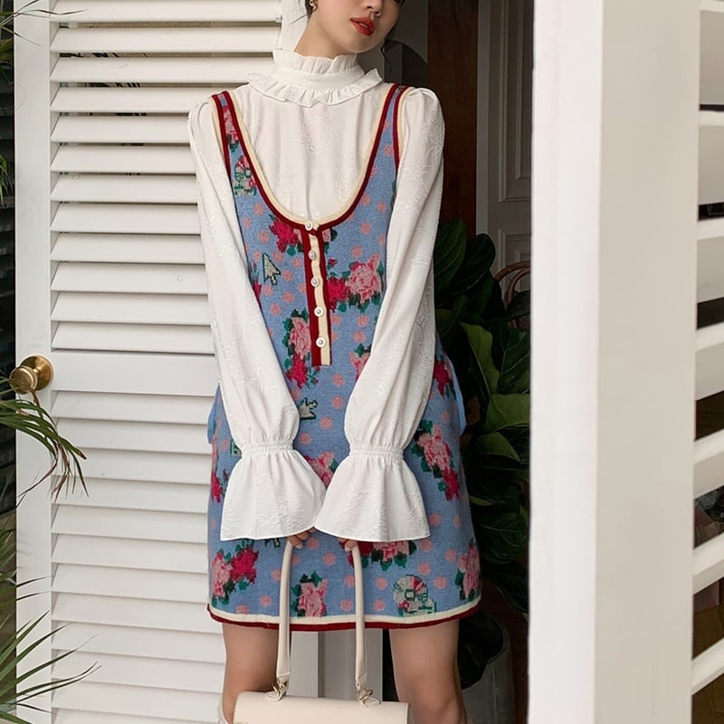 レトロ 花柄 ニットベスト スカート ミニワンピース セットアップ可 *se031