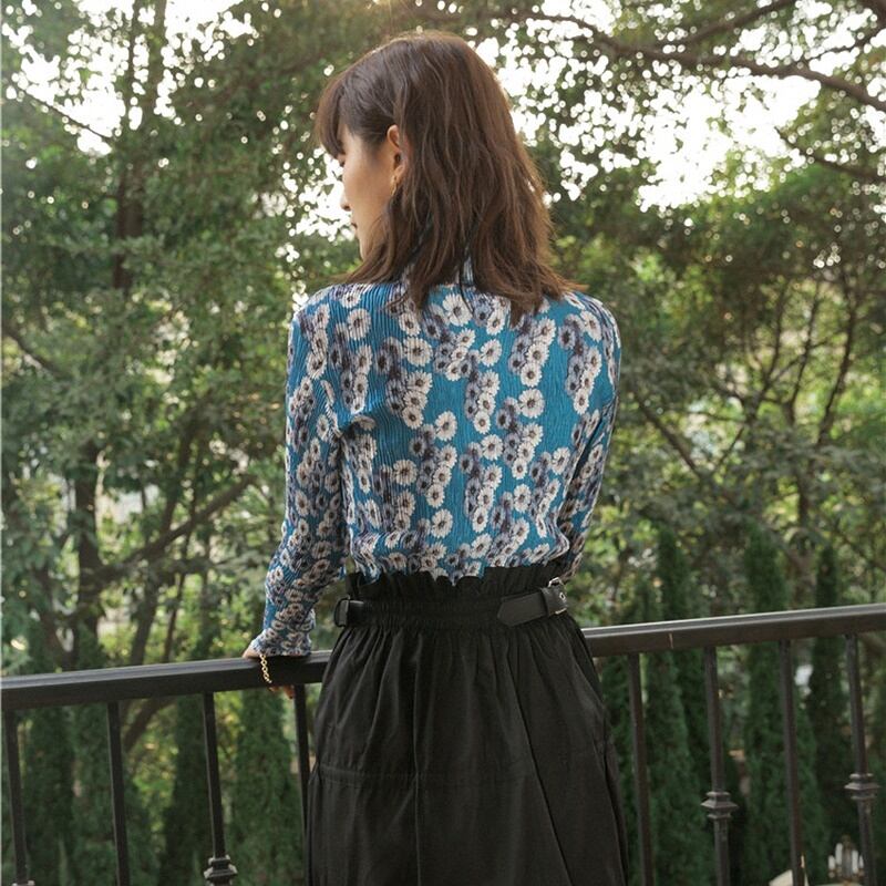 鮮やかなブルーにフローラル柄が映えるニットトップス。