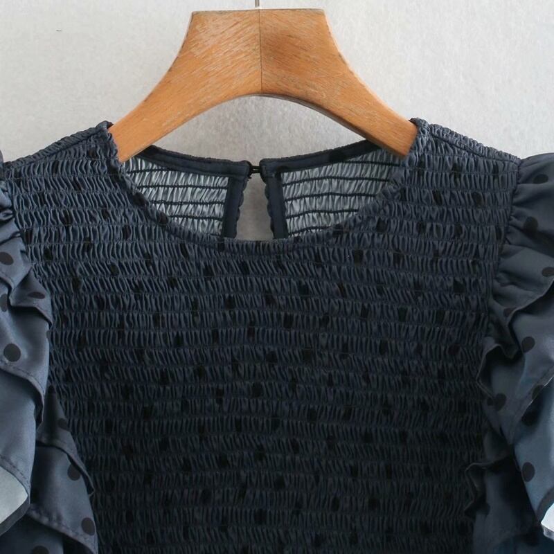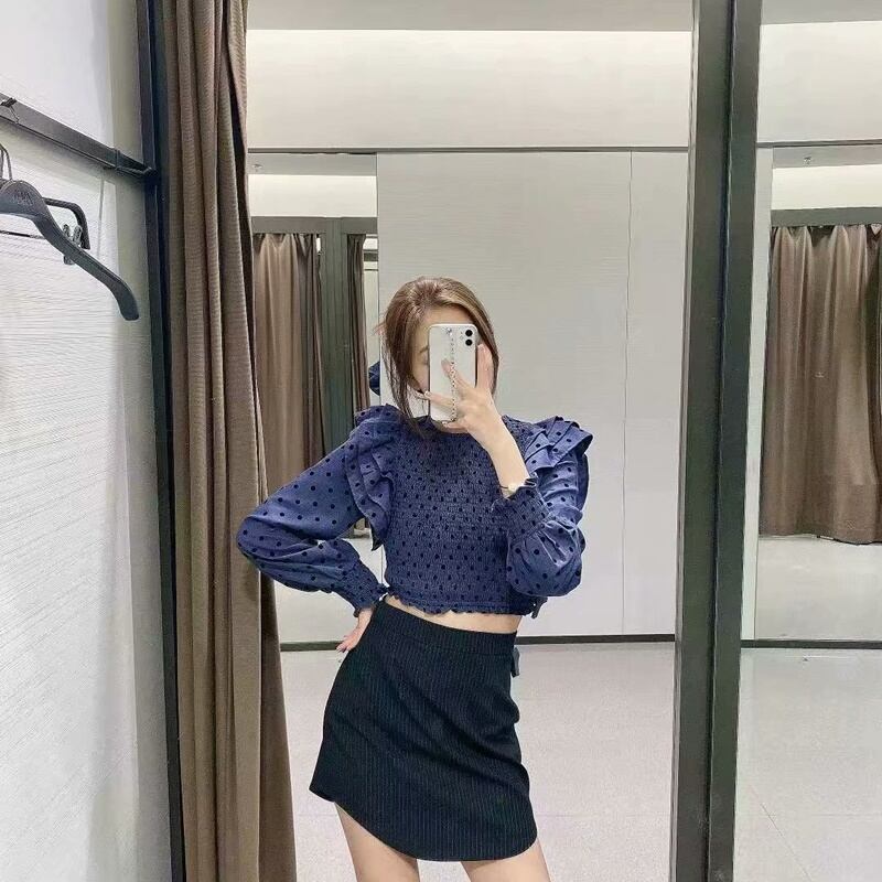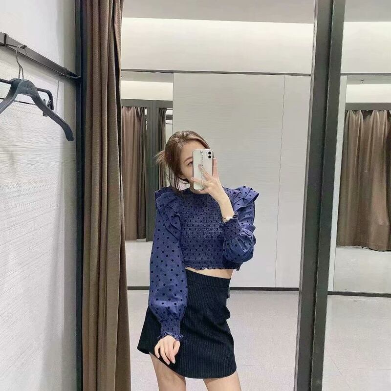 ドット柄 フリル ショート丈 長袖 シャツ ブラウス *bl154