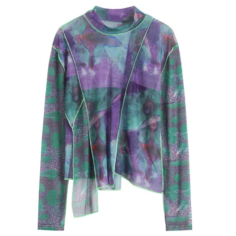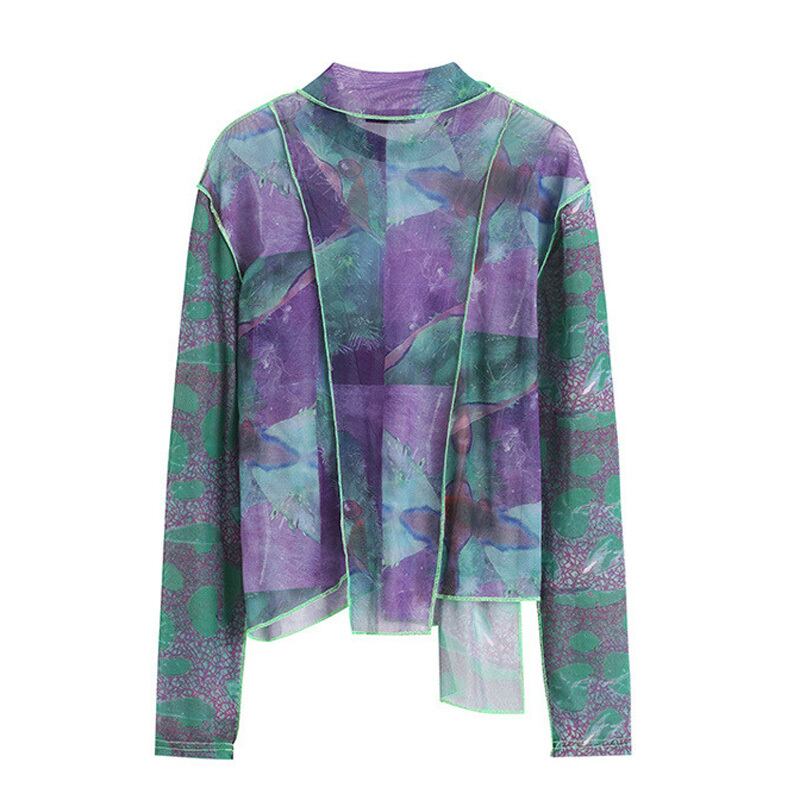アシンメトリー メッシュ ステッチ プルオーバー シャツ ブラウス *bl158