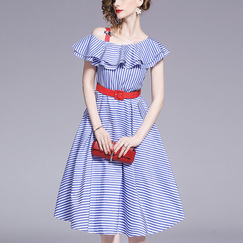 ストライプ ワンショルダー ベルト付き ワンピース *on168