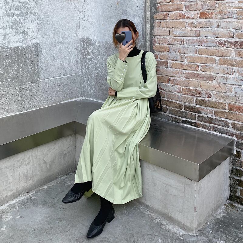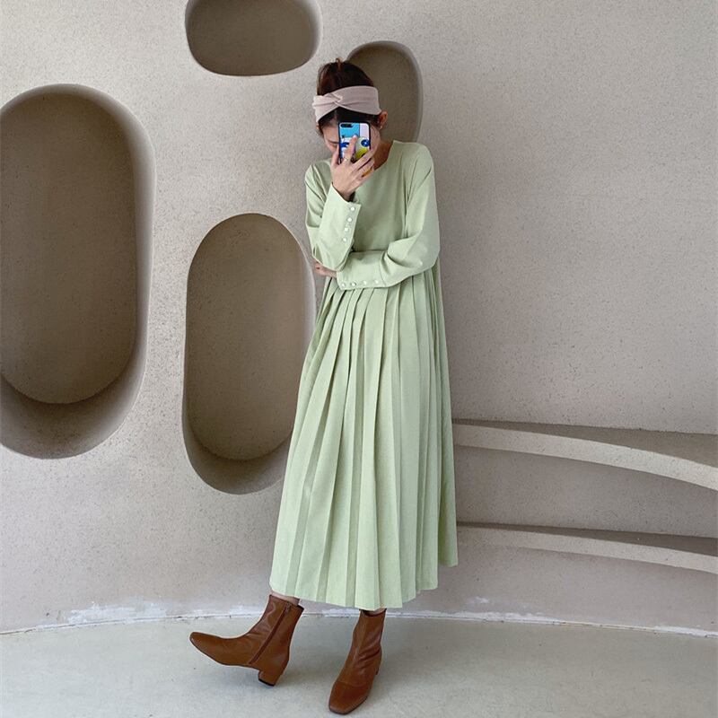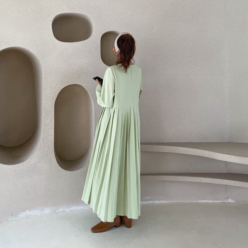 シンプル プリーツ ラウンドネック ロング ワンピース *on177