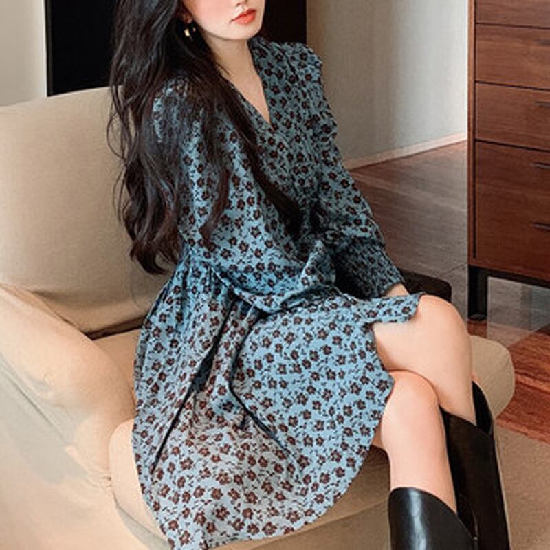 2カラー 花柄 Vネック 長袖 ワンピース *on192