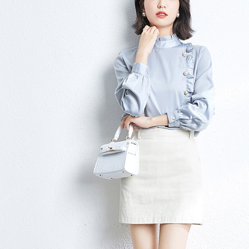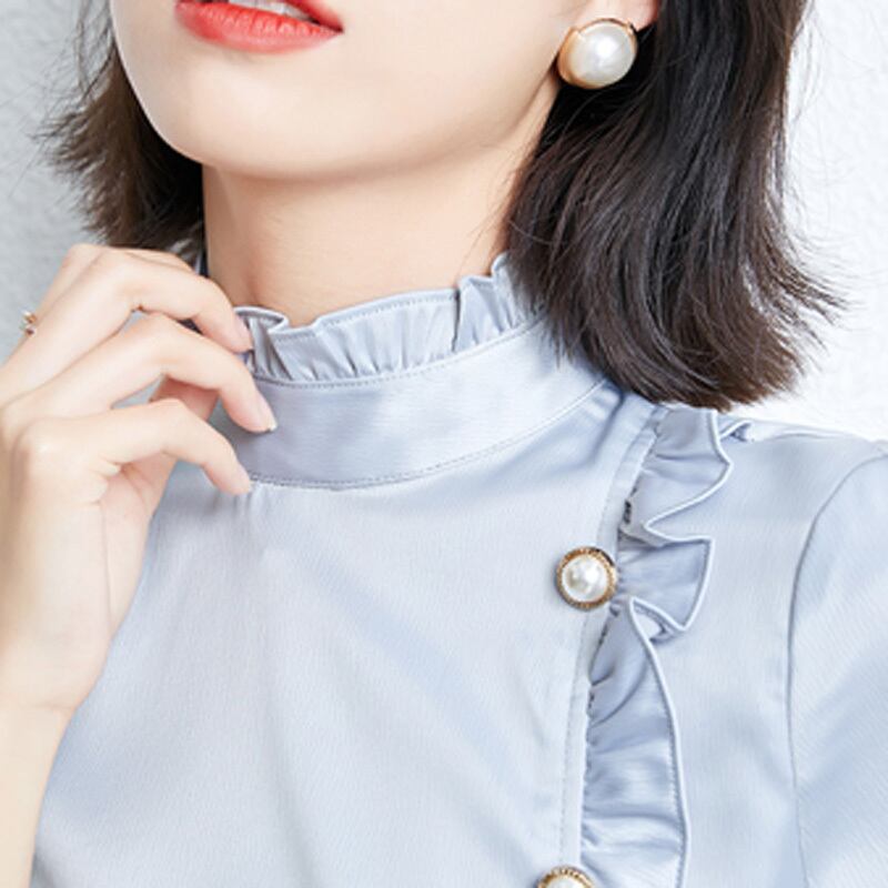 ボタン フリル シフォン 光沢 シャツ ブラウス *bl188