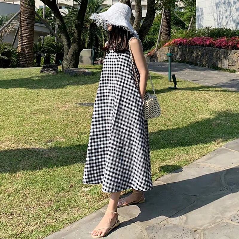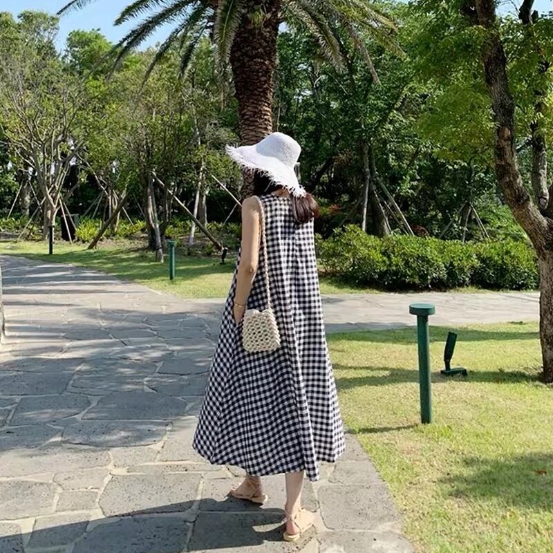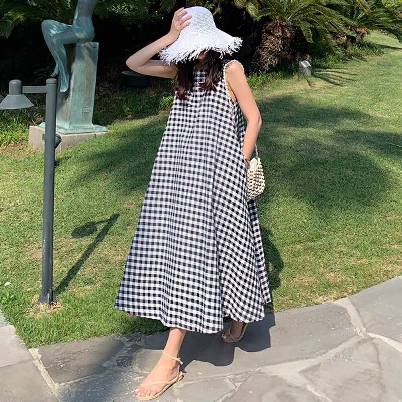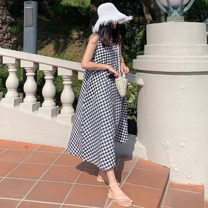 チェック ラウンドネック ノースリーブ ロングワンピース *on197