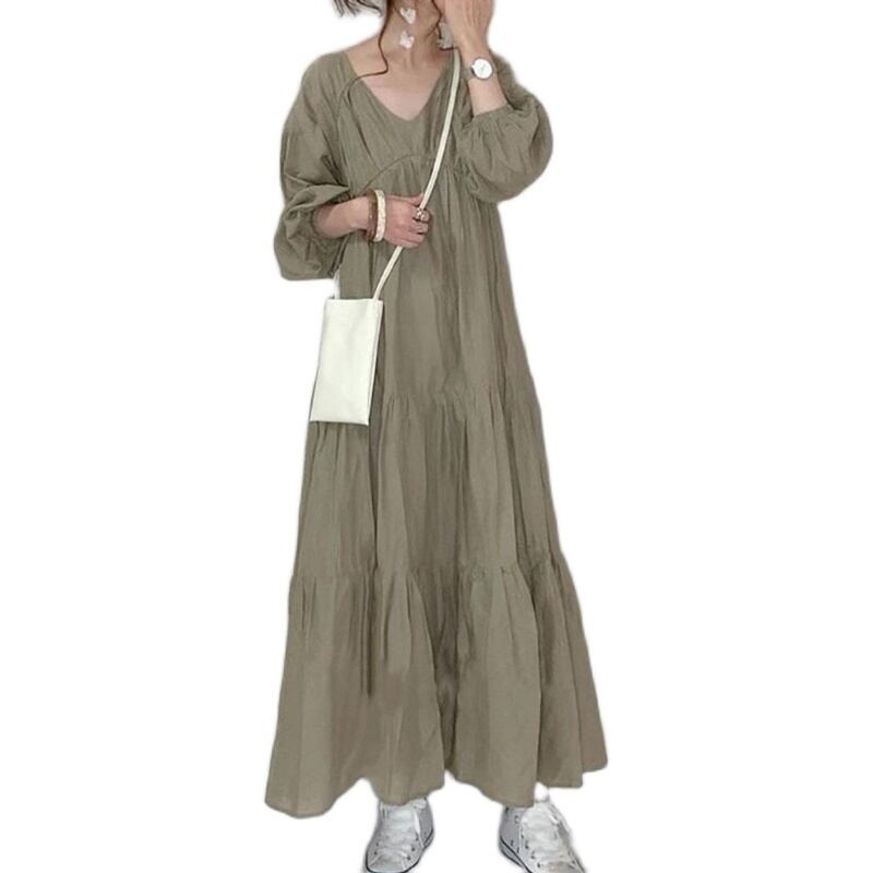ギャザー ボリューム袖 Vネック ロング ワンピース *on201