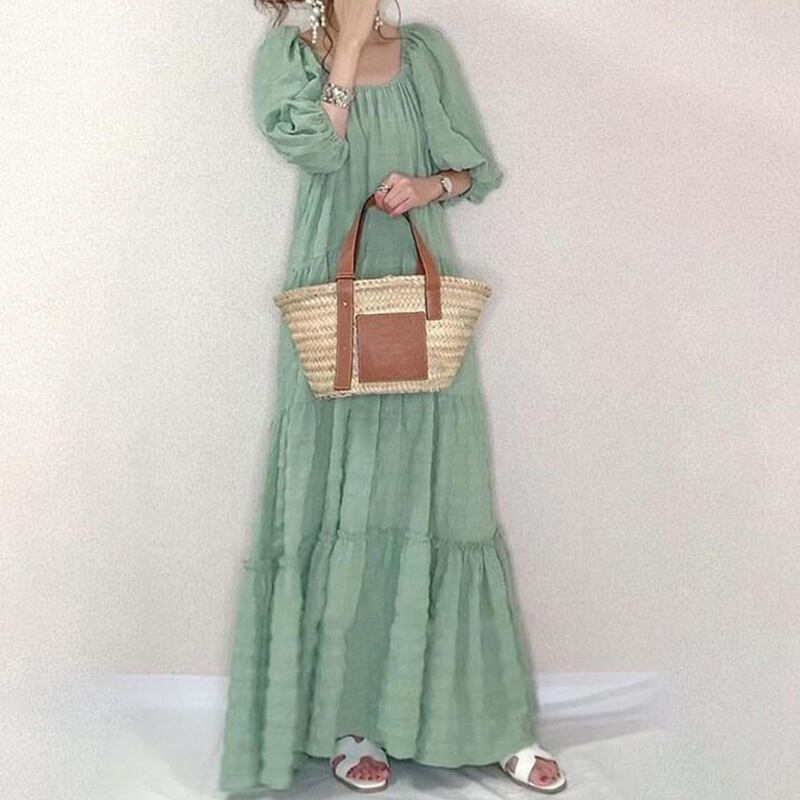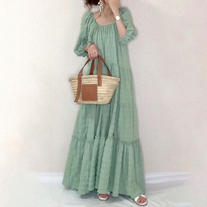 ギャザー ボリューム袖 スクエアネック ロング ワンピース *on202