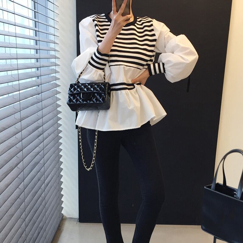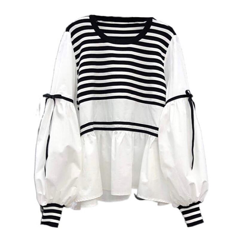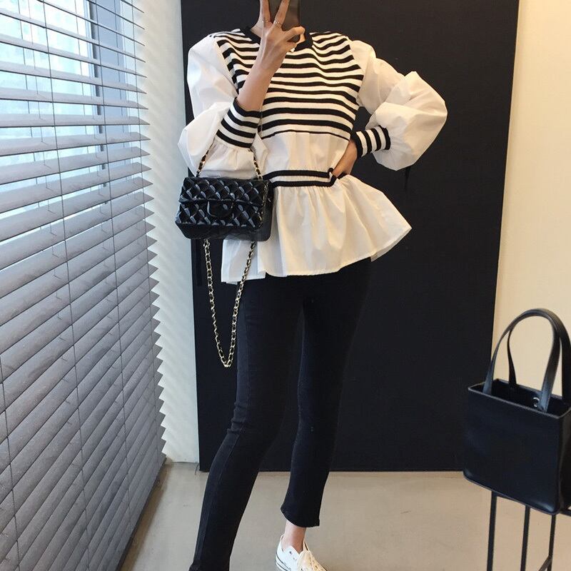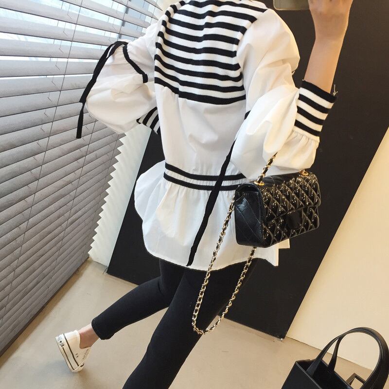 白黒ボーダーが目を引くデザインのブラウスです。