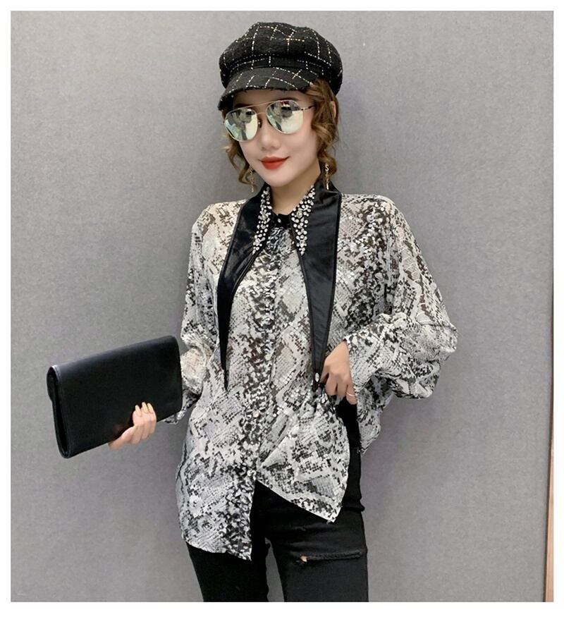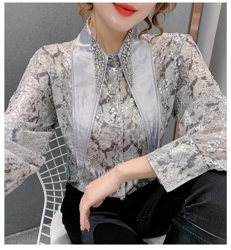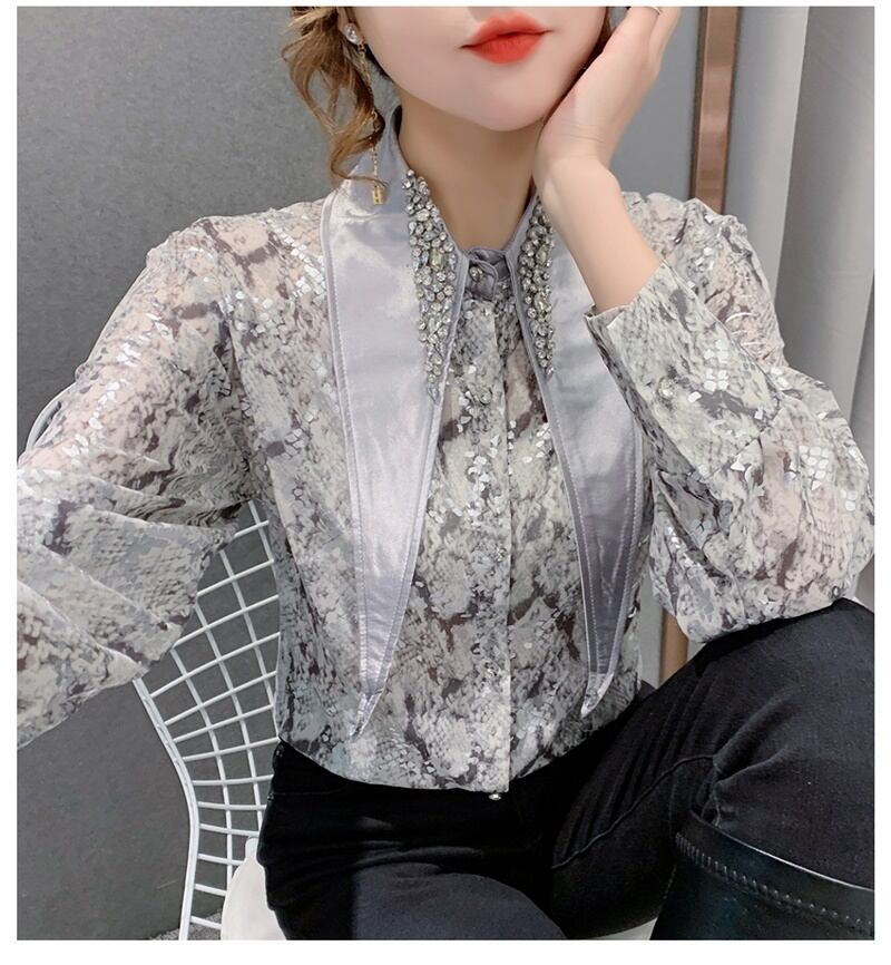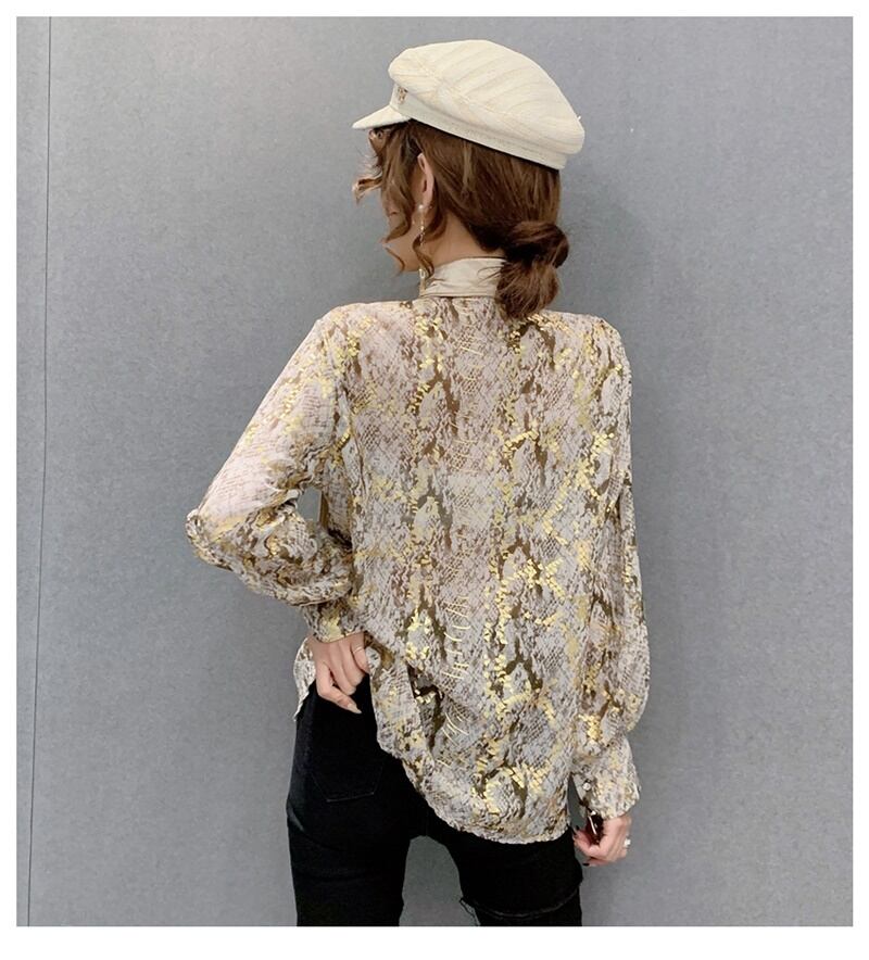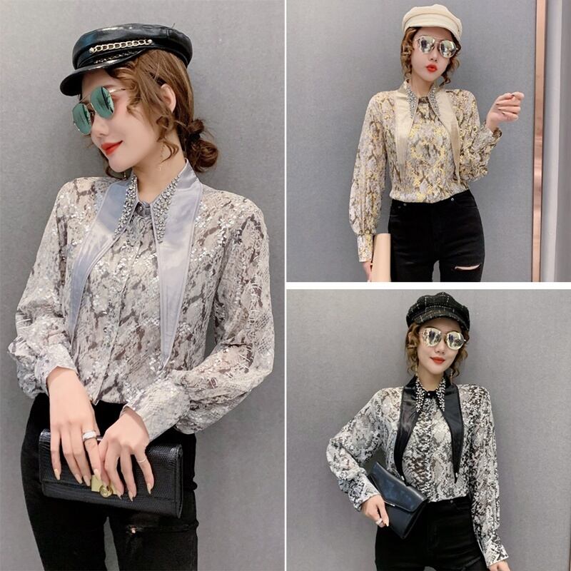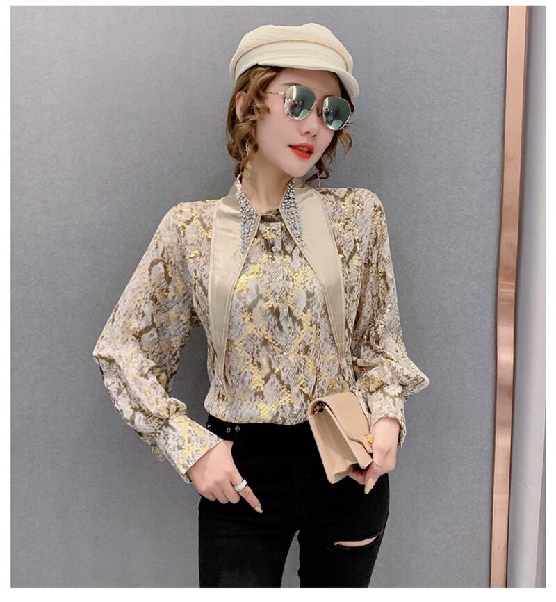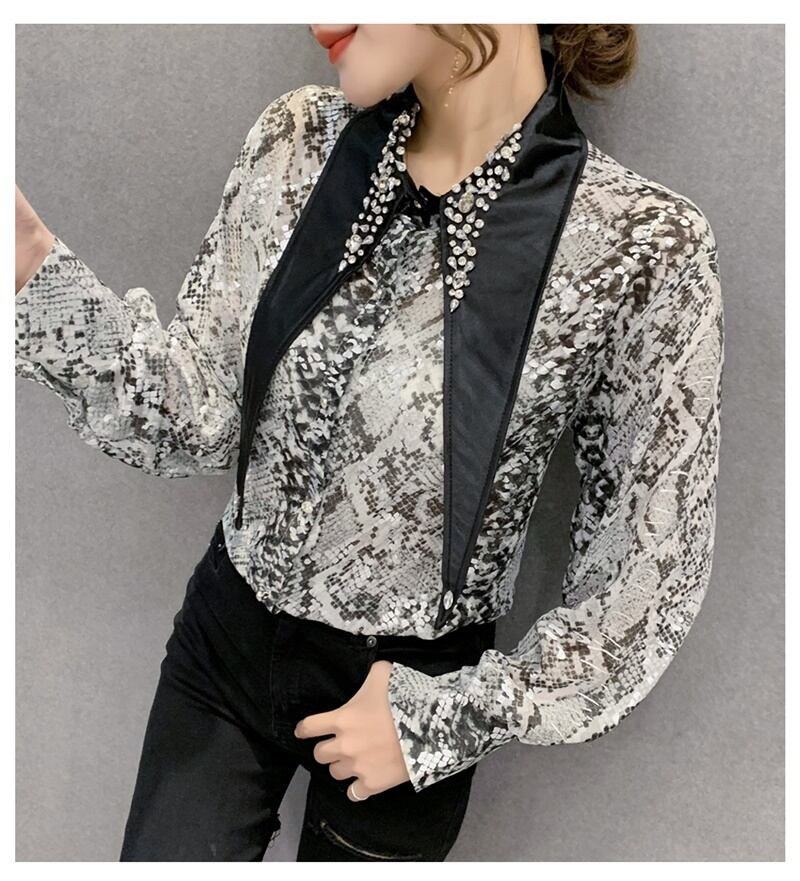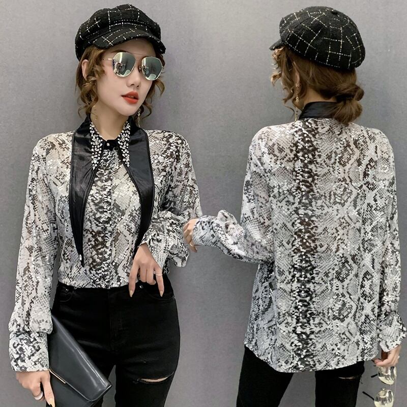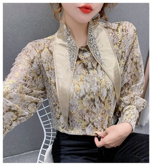 3カラー ビジュー パイソン柄 長袖 シャツ ブラウス *bl201