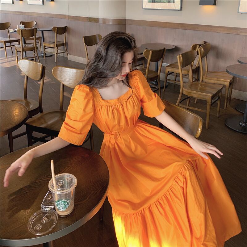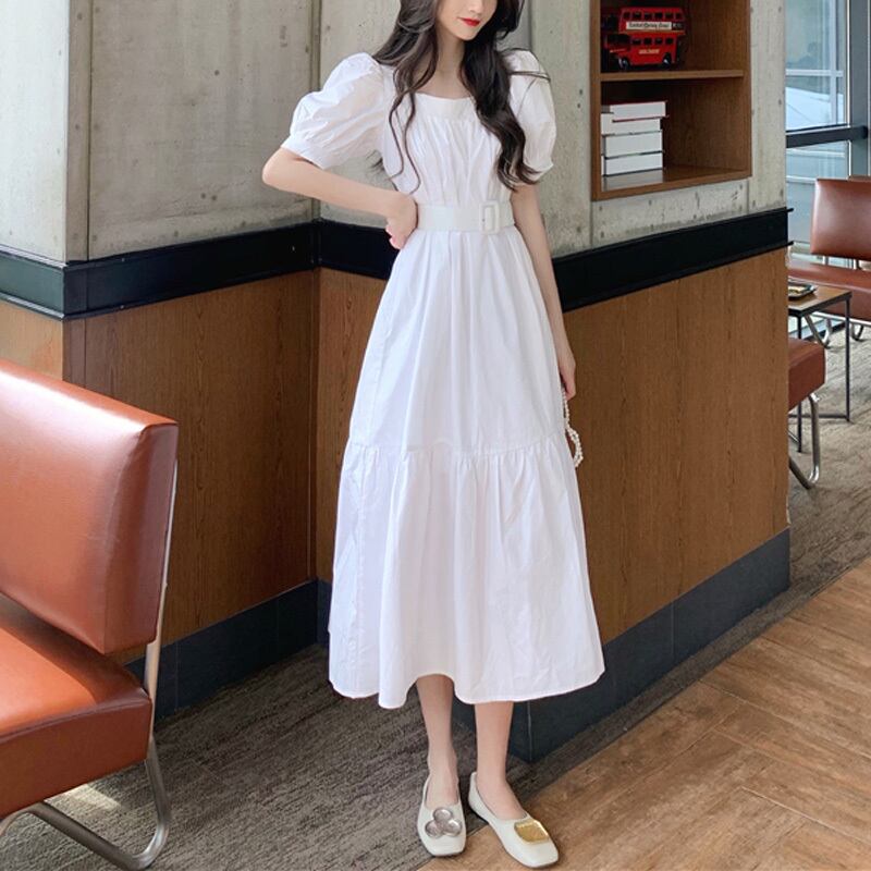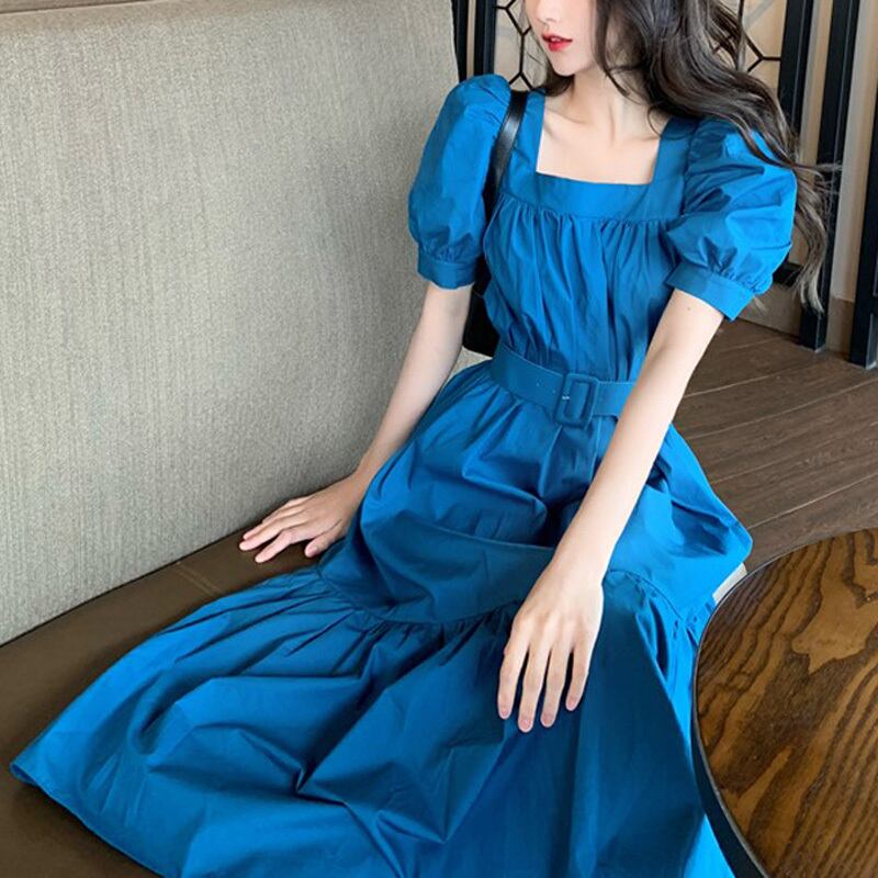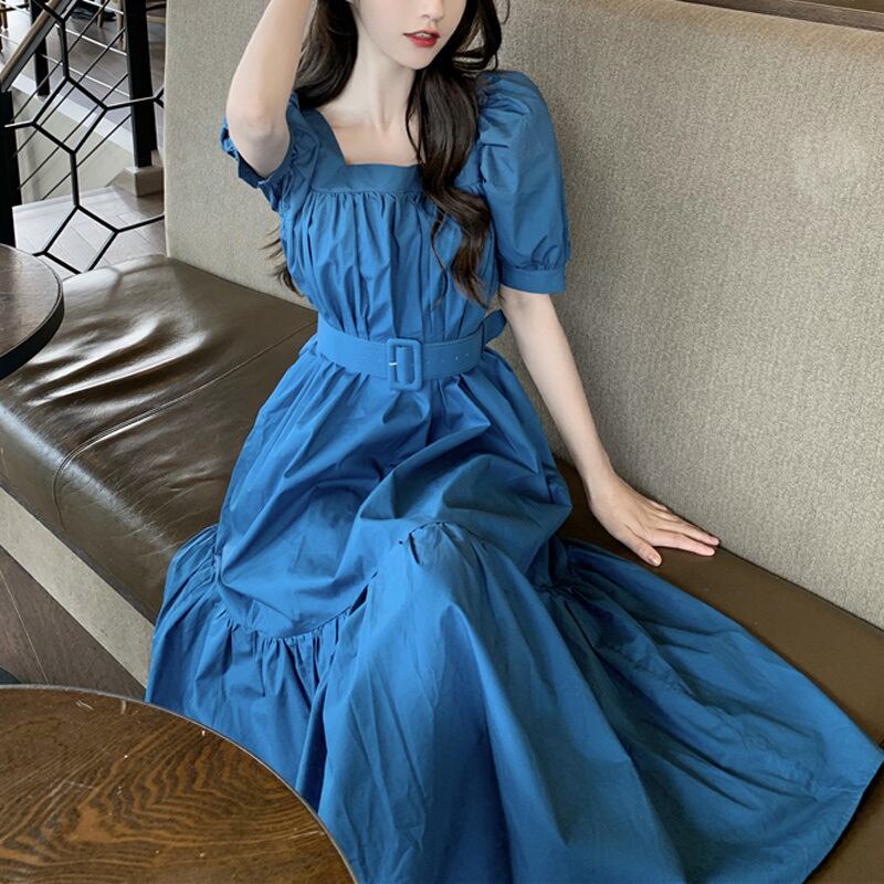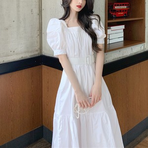 3カラー パフスリーブ ベルト スクエアネック 半袖 ワンピース *on212