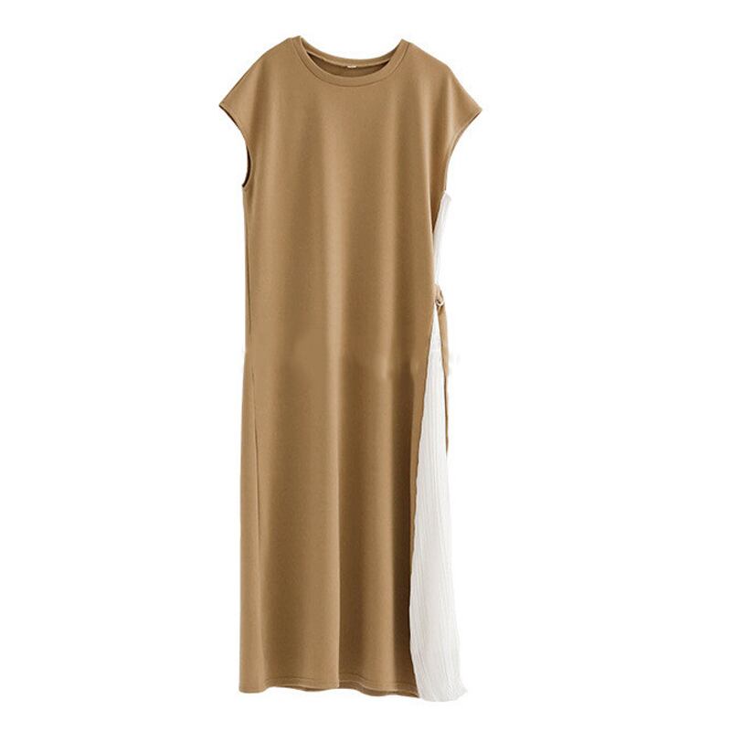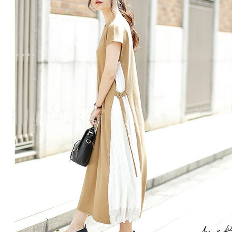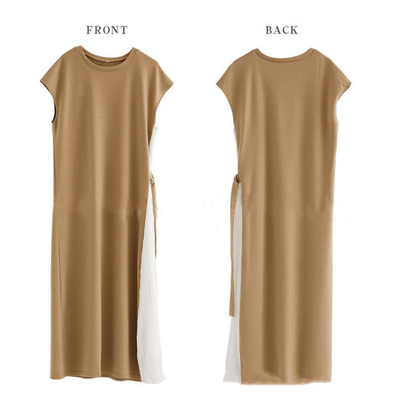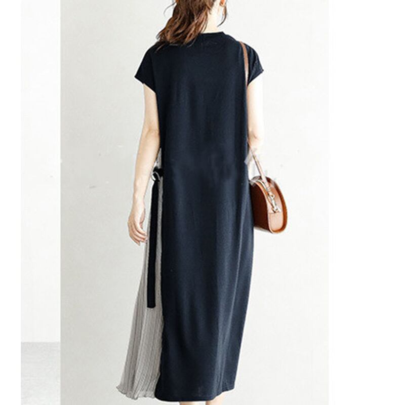 3カラー サイドプリーツ ラウンドネック 半袖 ワンピース *on223