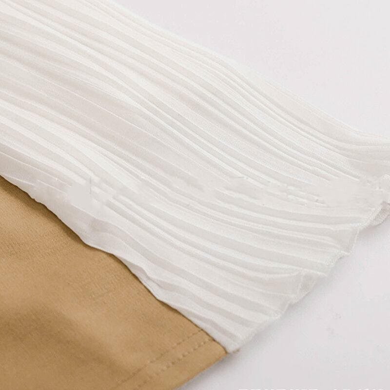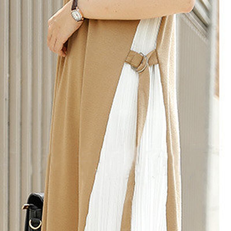 サイドプリーツの異素材切り替えデザインで重ね着しているように見えます。