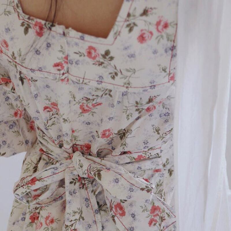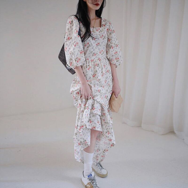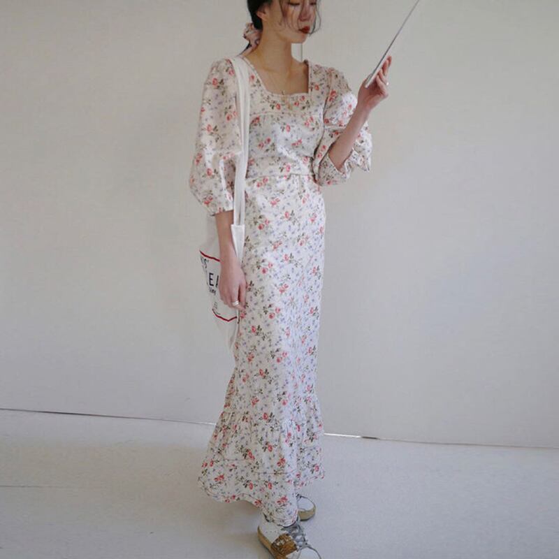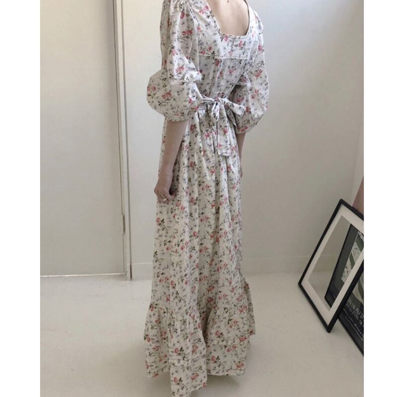 フローラル スクエアネック パフスリーブ ロング ワンピース *on226