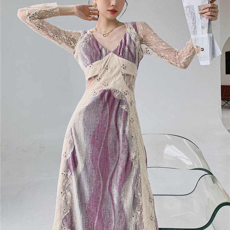 シアー フローラル 刺繍 Vネック ドレス ワンピース *on242