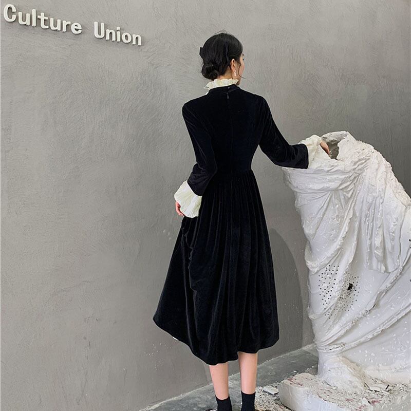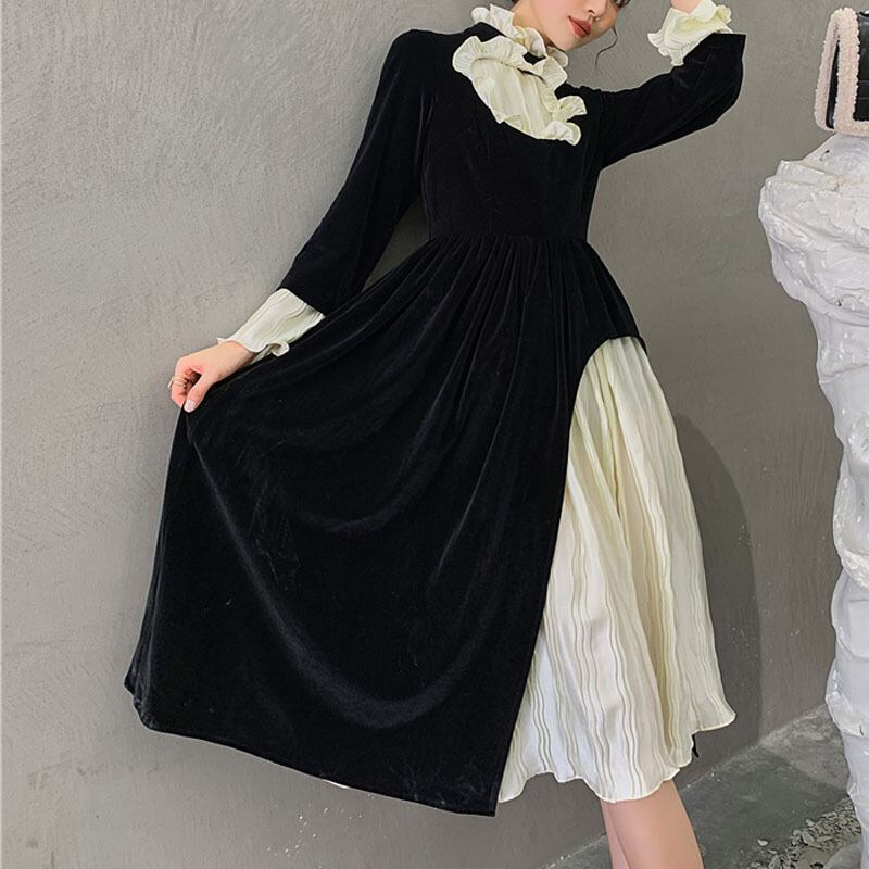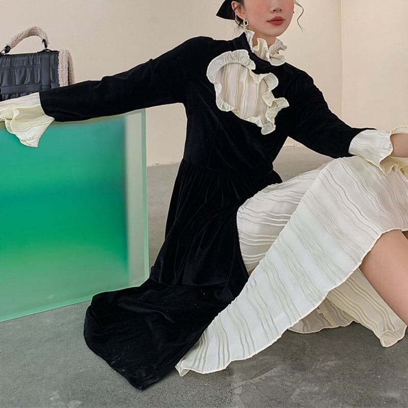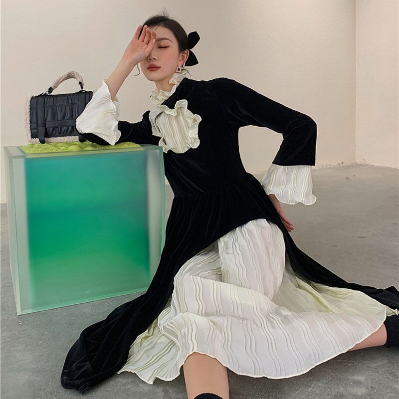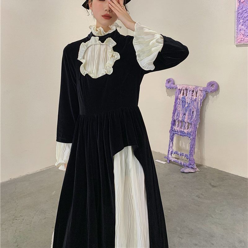 アシンメトリー フリル 重ね着風 長袖 ワンピース *on245