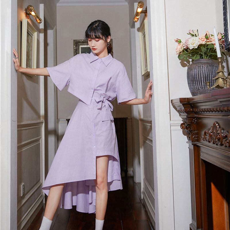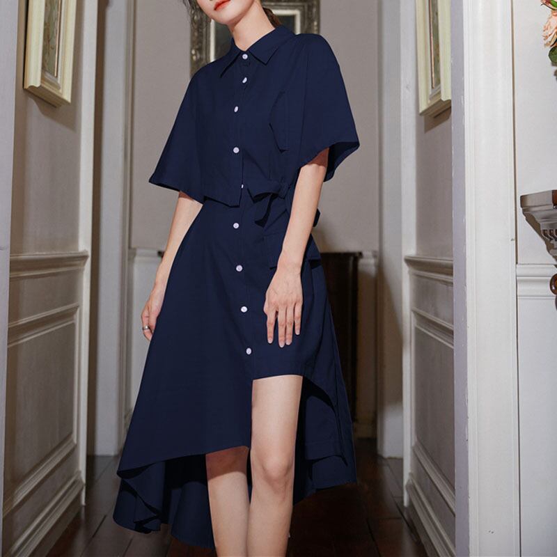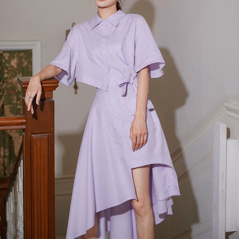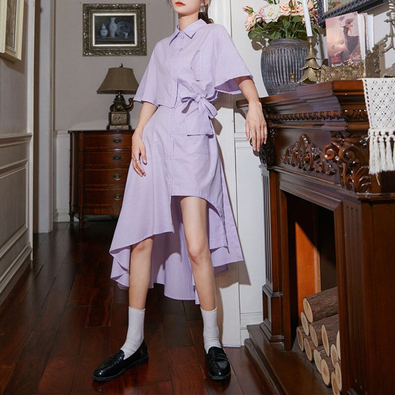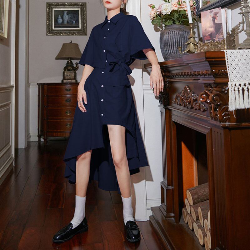 2カラー アシンメトリー リボン 半袖 シャツワンピース *on252