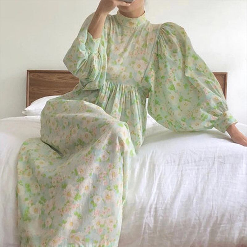 フローラル パフスリーブ プリーツ 長袖 ワンピース *on256