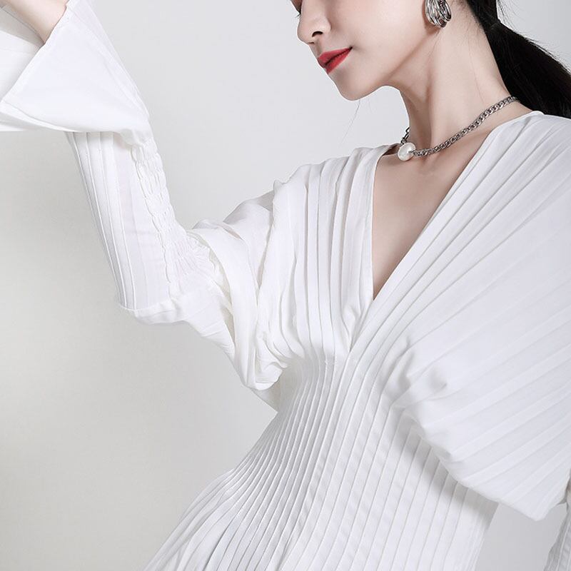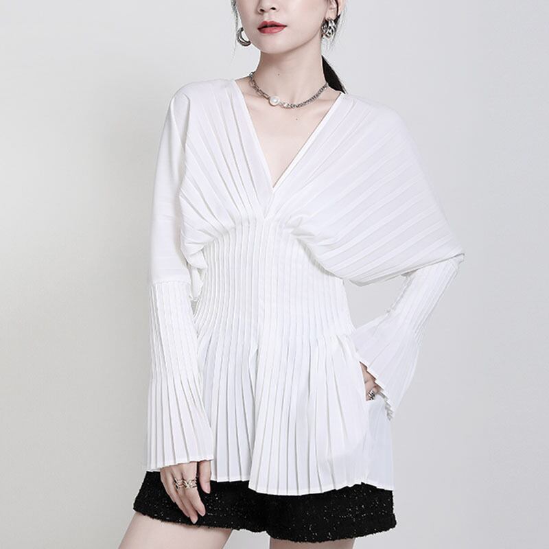 プリーツ Vネック 長袖 シャツ ブラウス セットアップ可 *se040