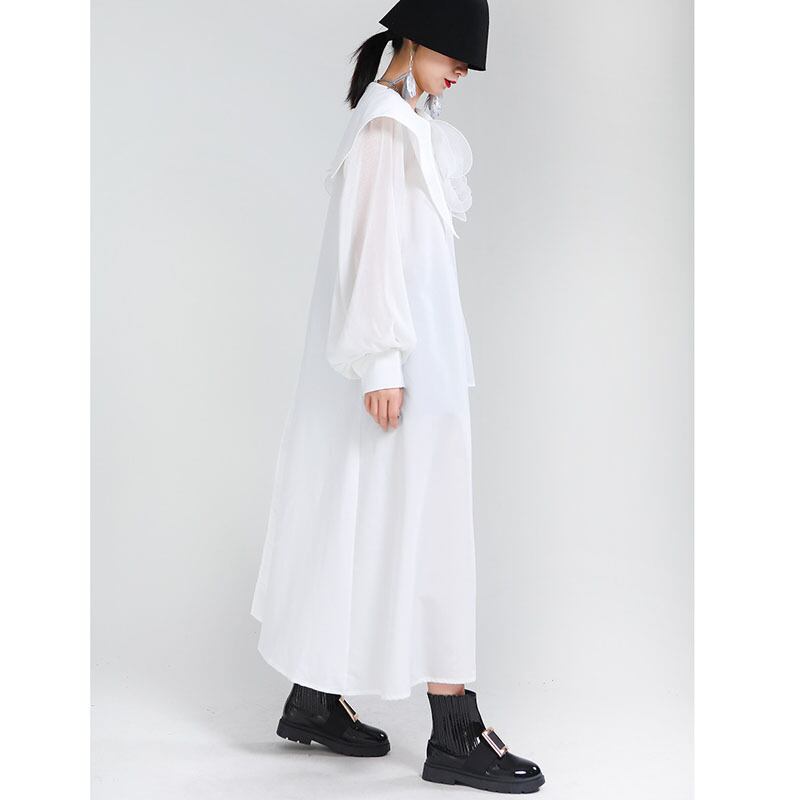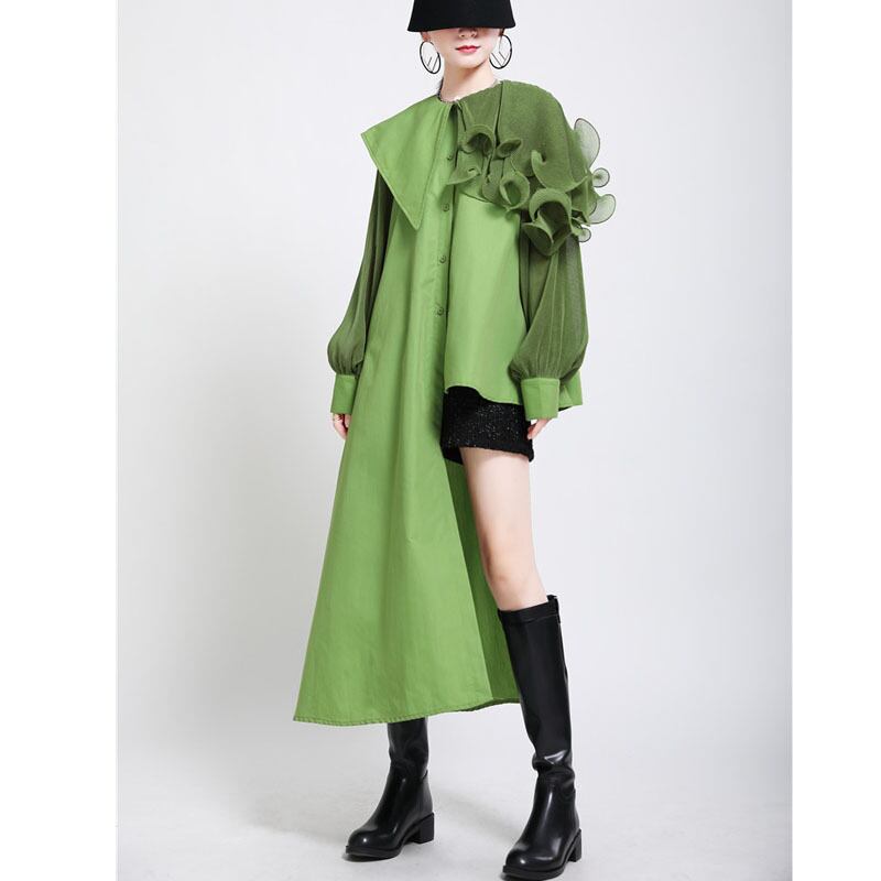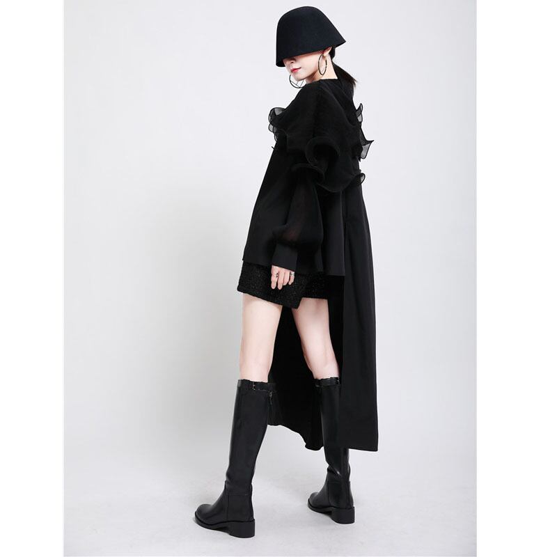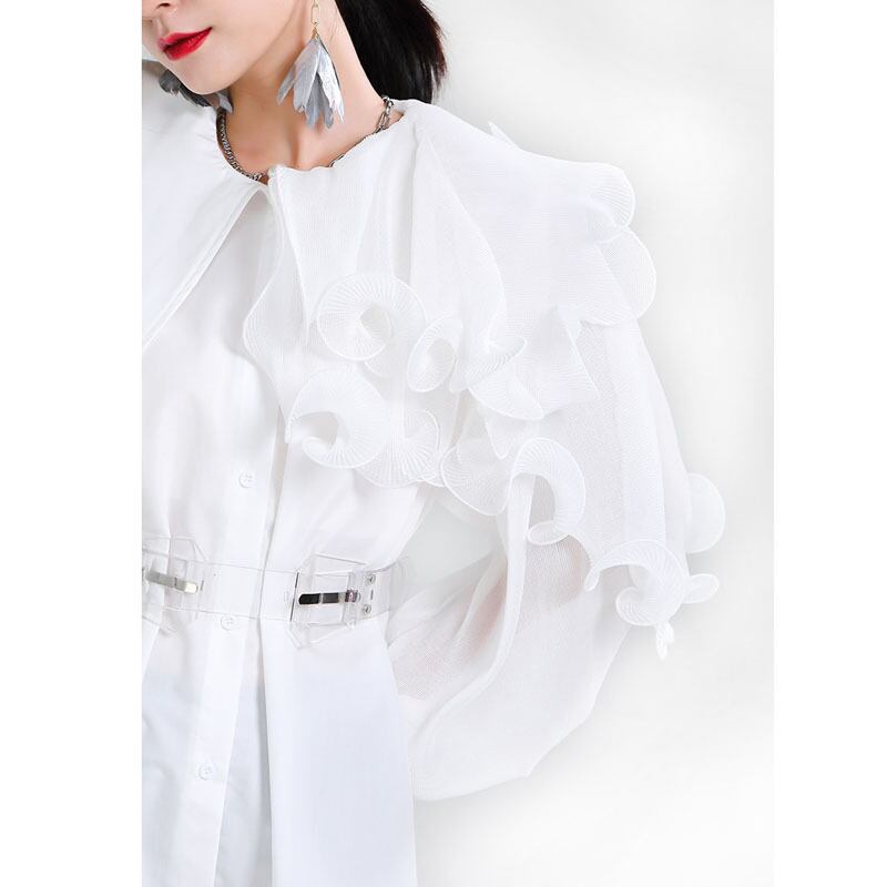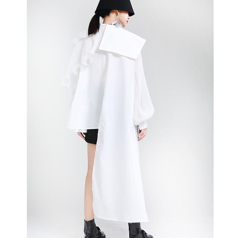 アシンメトリーデザインとフリルで動きと立体感があります。
