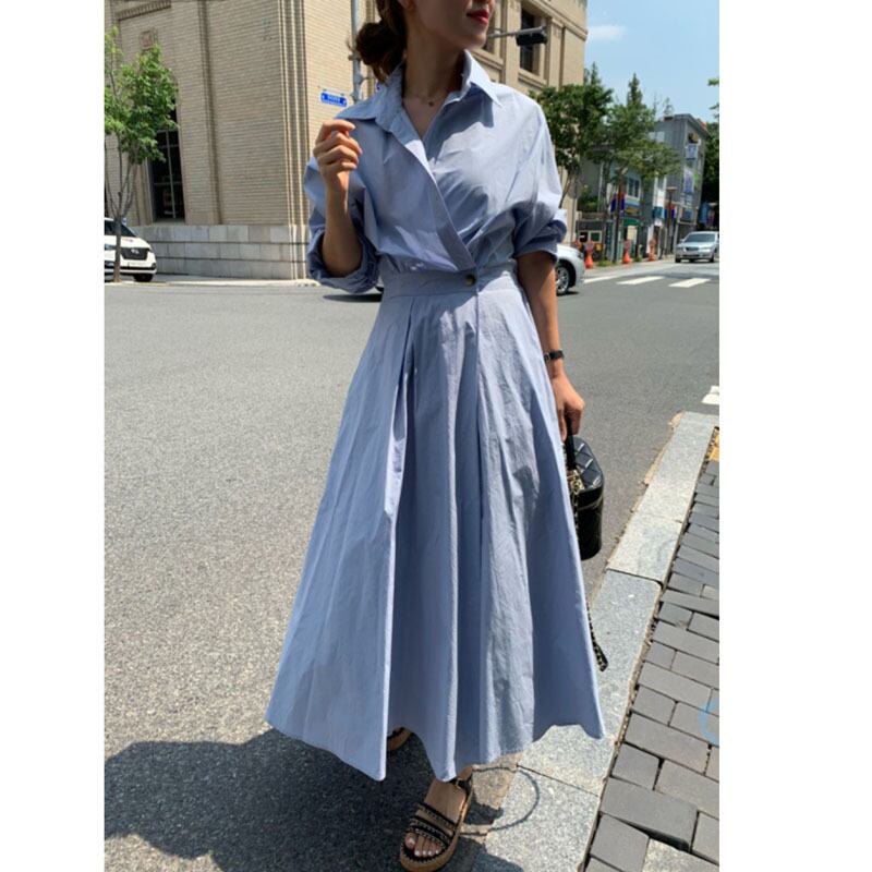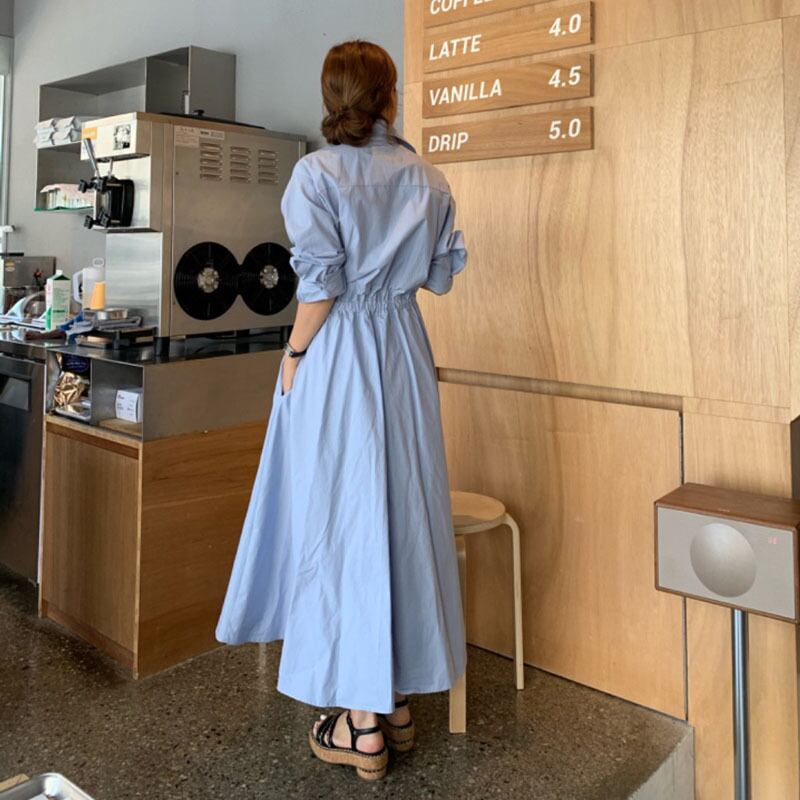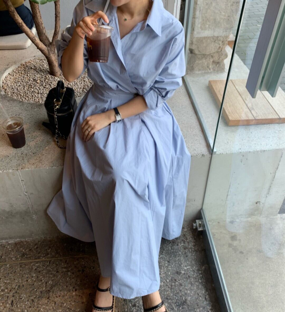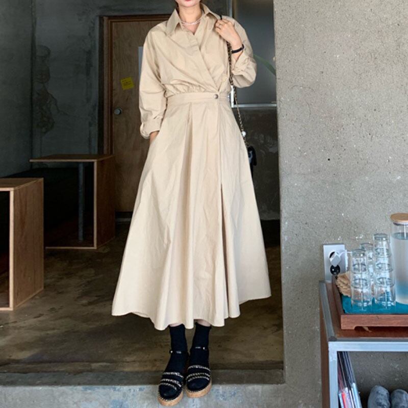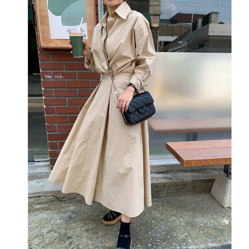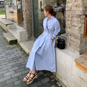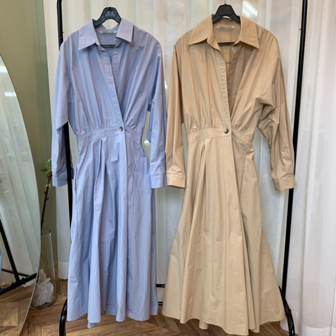 2カラー ウエストボタン 長袖 シャツワンピース *on269