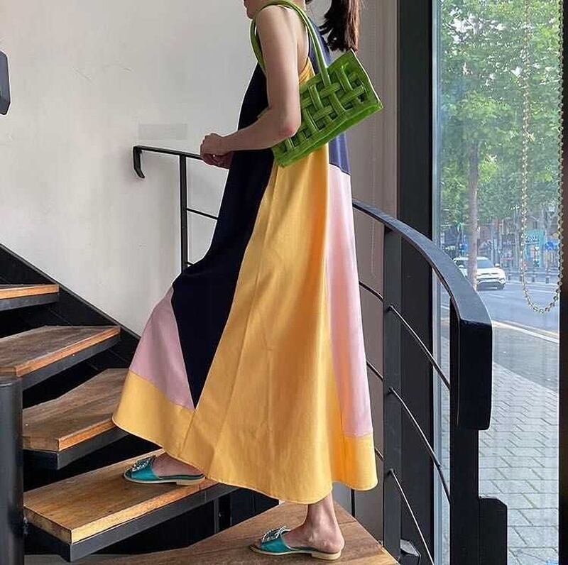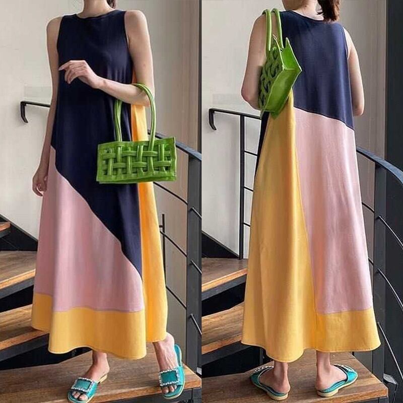 トリコロール ラウンドネック ノースリーブ ワンピース *on272
