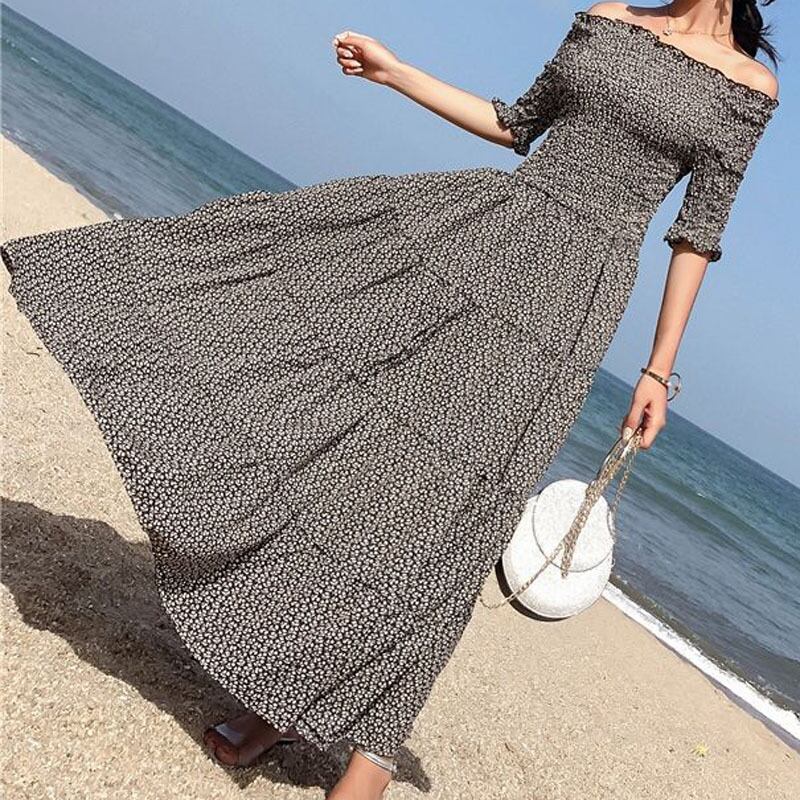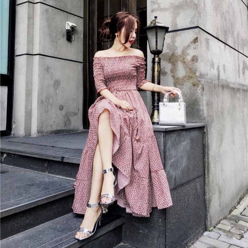 くしゅっとした素材が印象的な肩出しワンピースです。