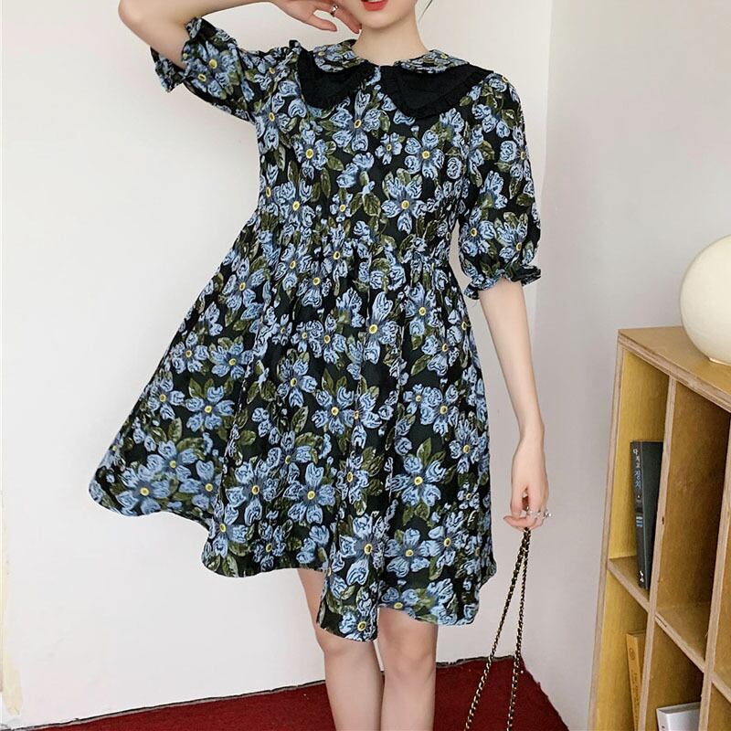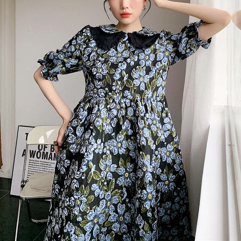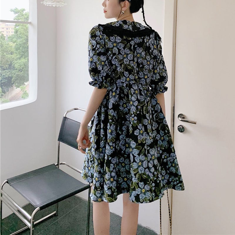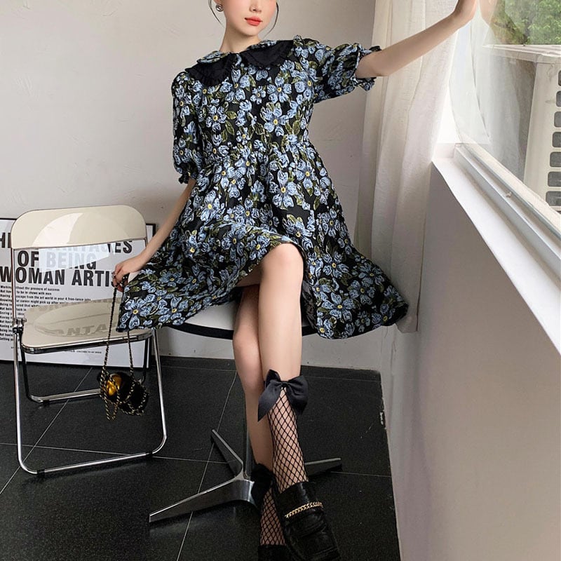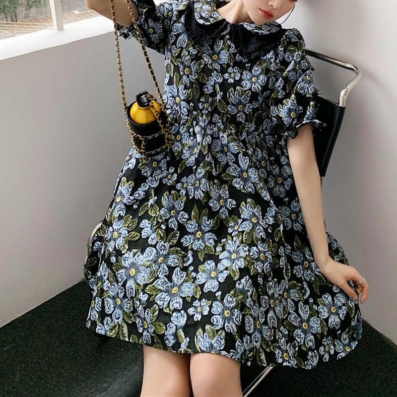 シック フローラル ダブルカラー 半袖 ワンピース *on285