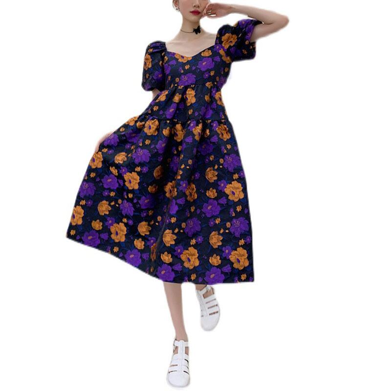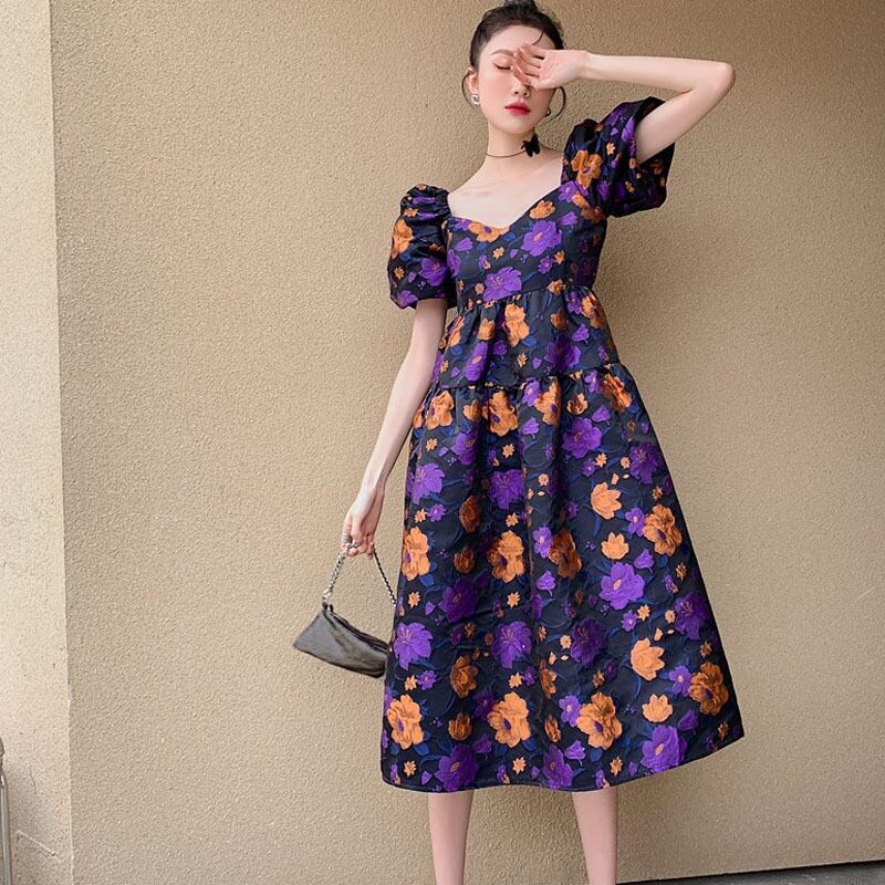 シック フローラル パフスリーブ 半袖 ワンピース *on288