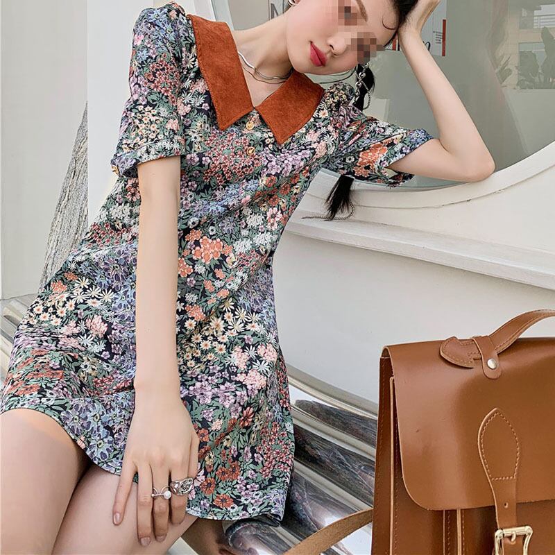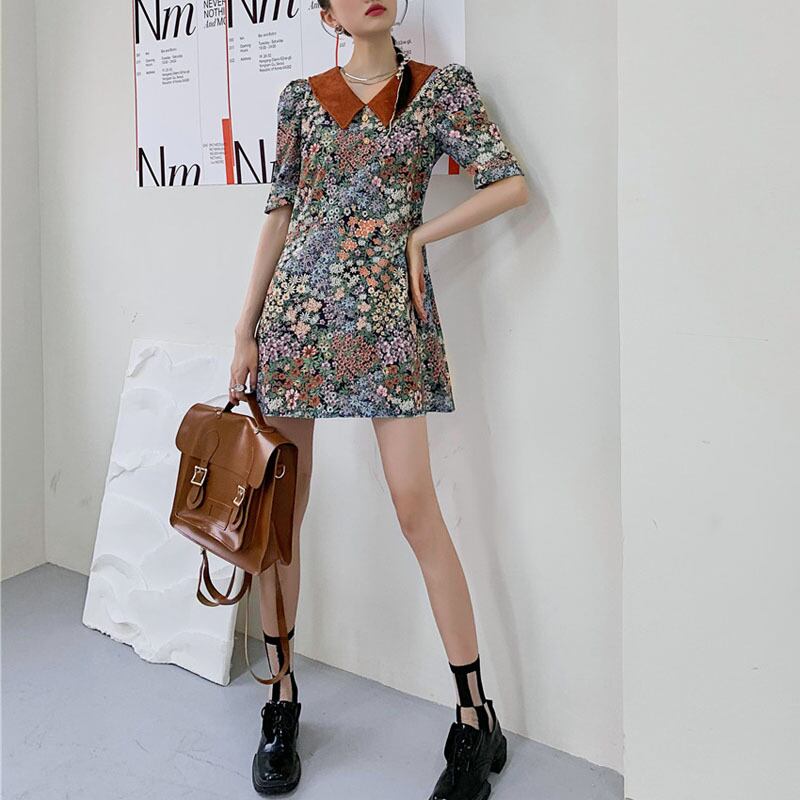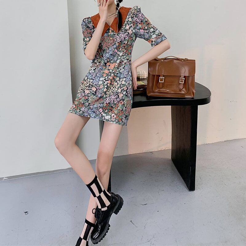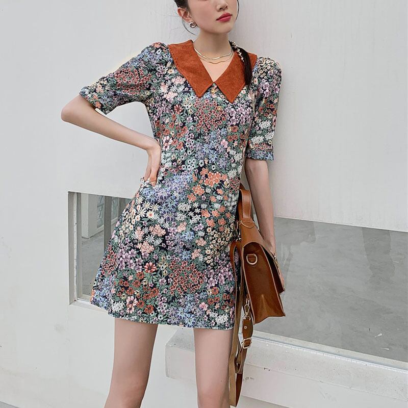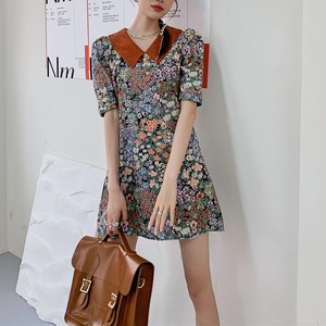 レトロ フローラル ミニ丈 半袖 ワンピース *on289