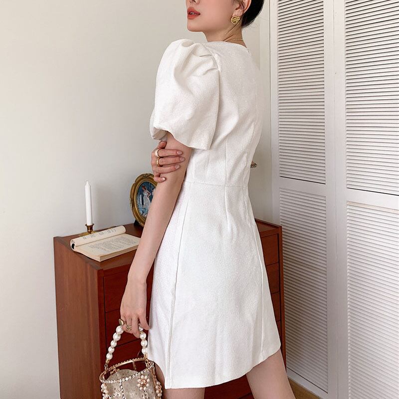 2カラー リボン Vネック パフスリーブ 半袖 ワンピース *on292