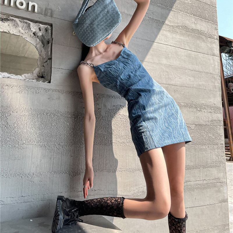 タイト デニム ノースリーブ チェーン ミニ丈 ワンピース *on293