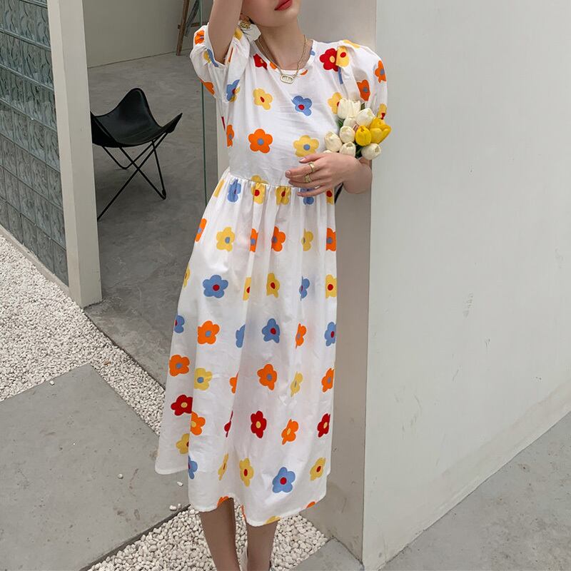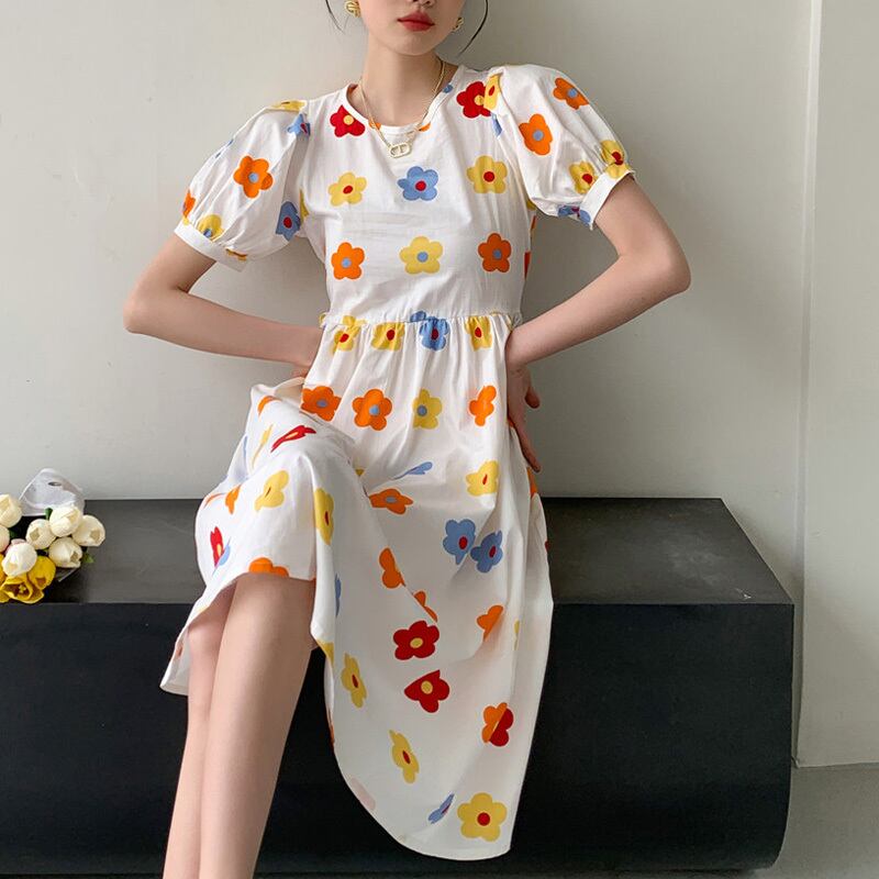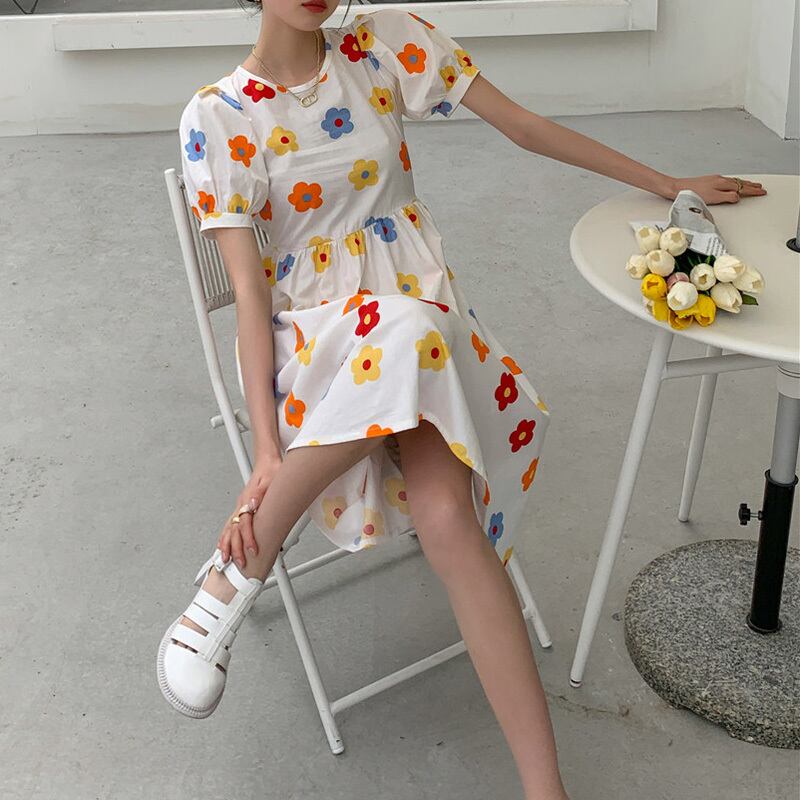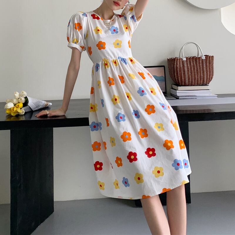 お花 イラスト プリント バックリボン 半袖 ワンピース *on296
