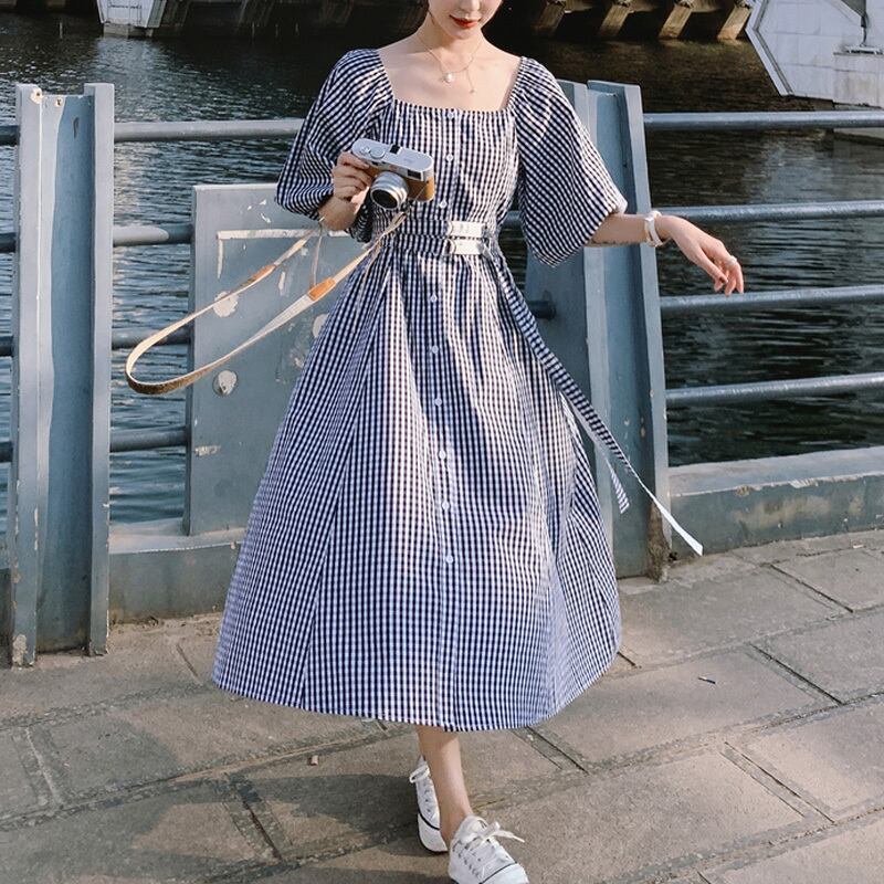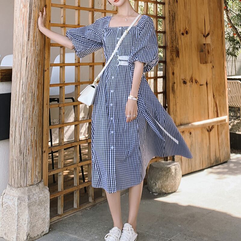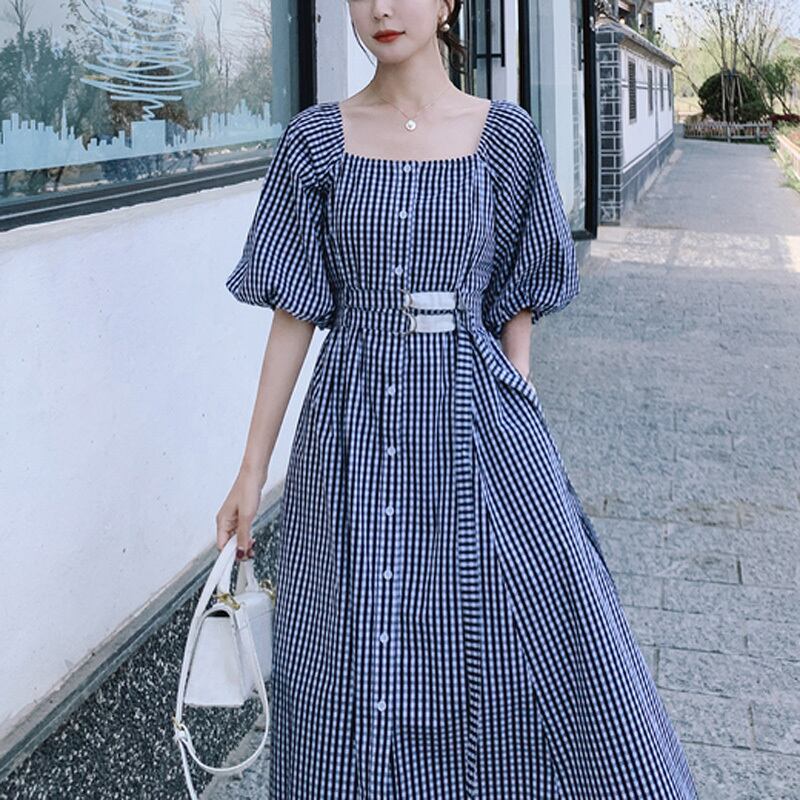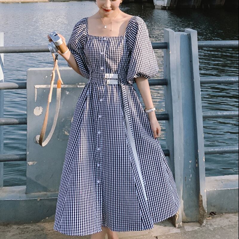 チェック柄 パフスリーブ スクエアネック 半袖 ワンピース *on299