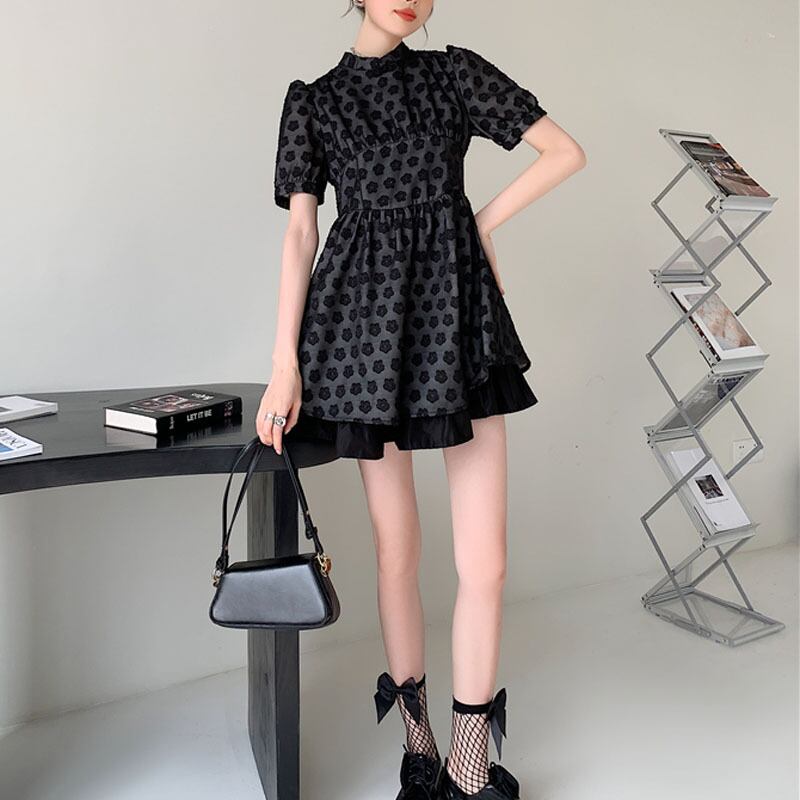 シック お花 刺繍 半袖 ミニ丈 ワンピース *on314