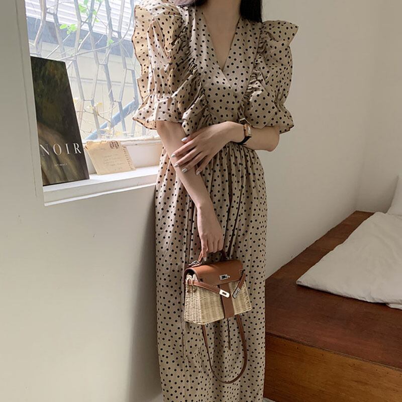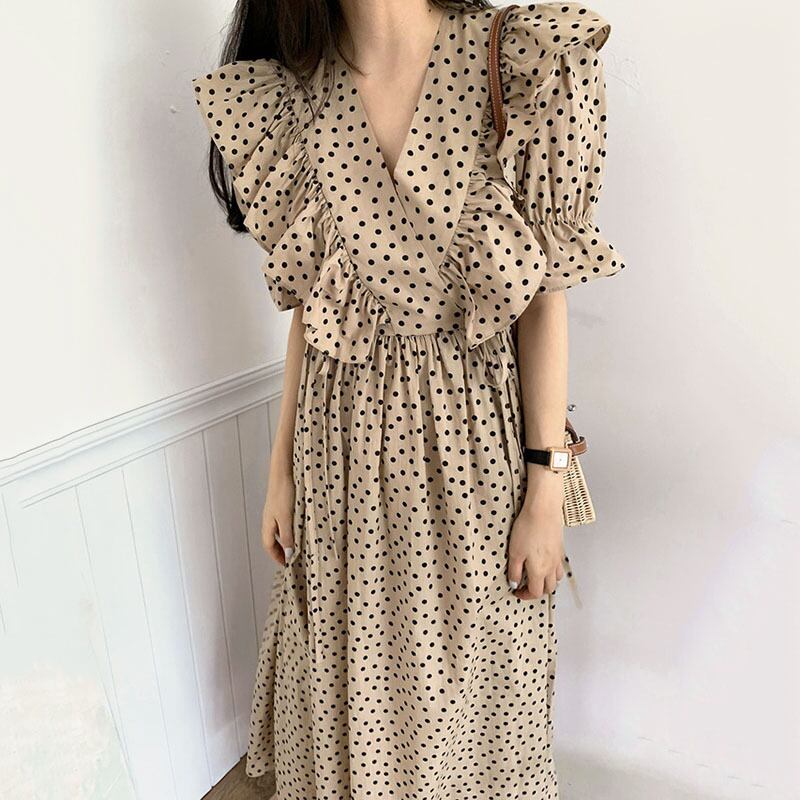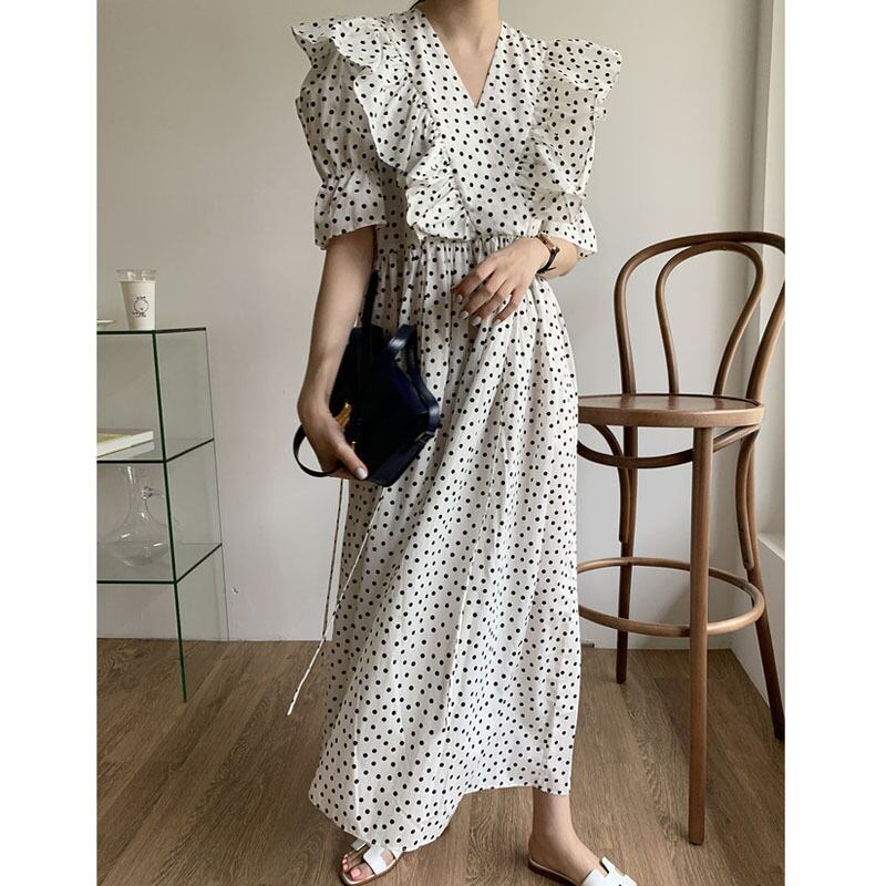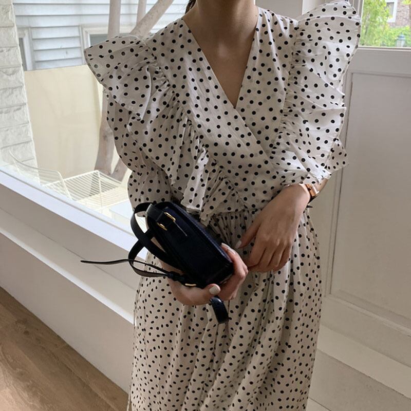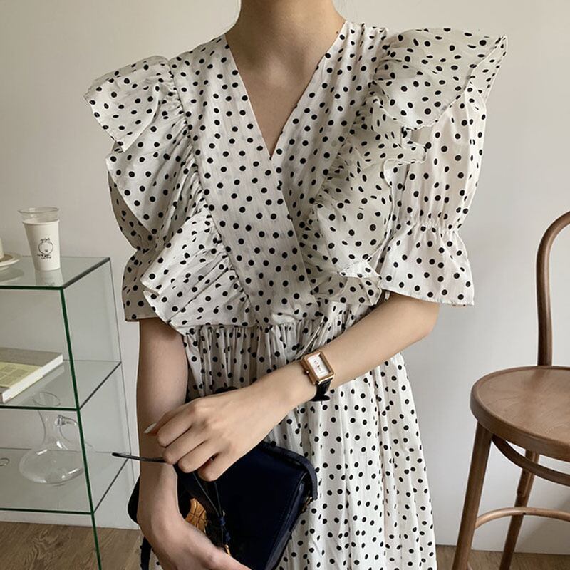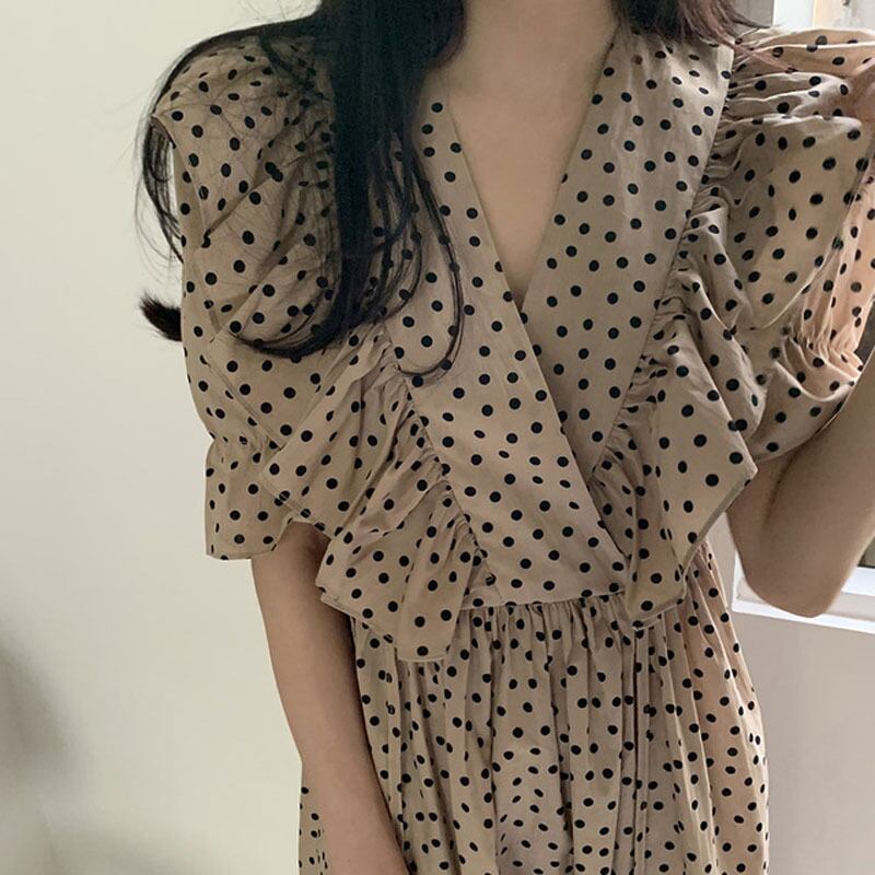 2カラー ドット柄 フリル Vネック 半袖 ドレス ワンピース *on329