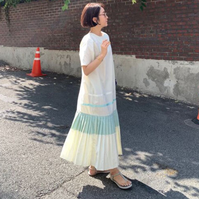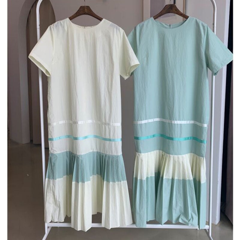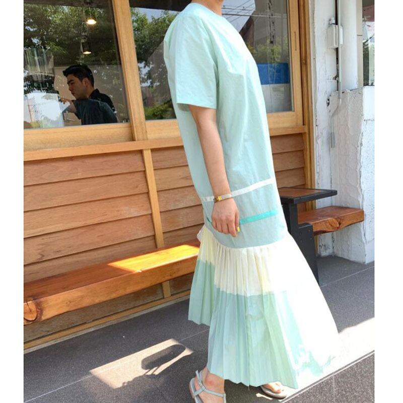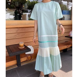2カラー ボーダー プリーツ ラウンドネック 半袖 ワンピース *on331