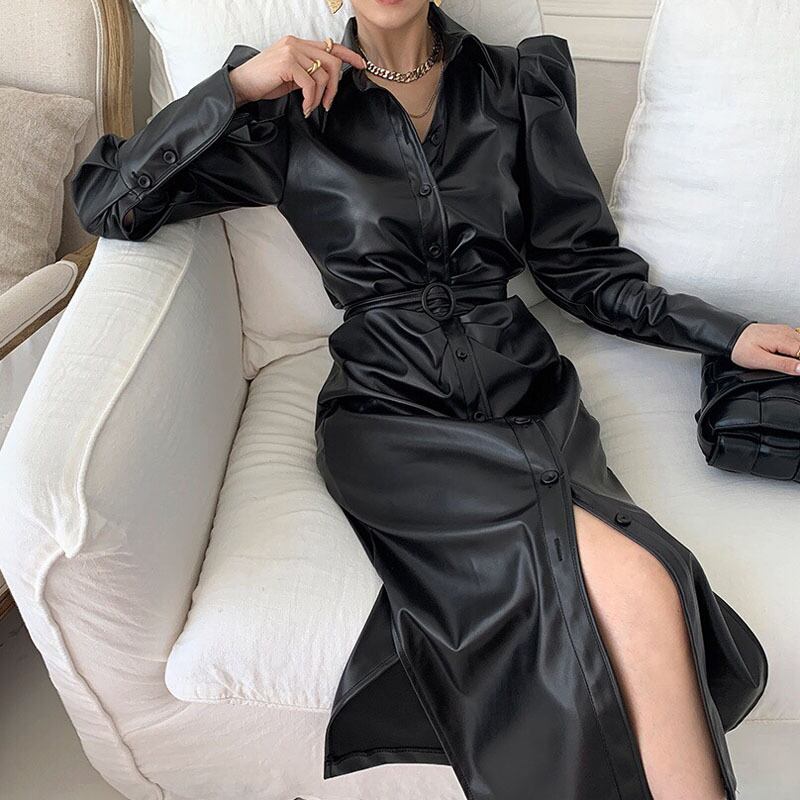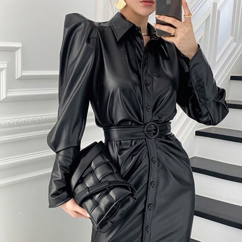 レザー ボリューム袖 長袖 タイト ワンピース *on346