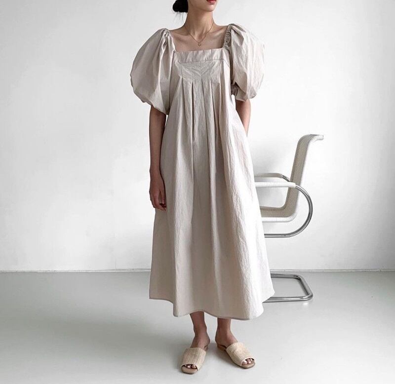 2カラー パフスリーブ スクエアネック 半袖 ワンピース *on348