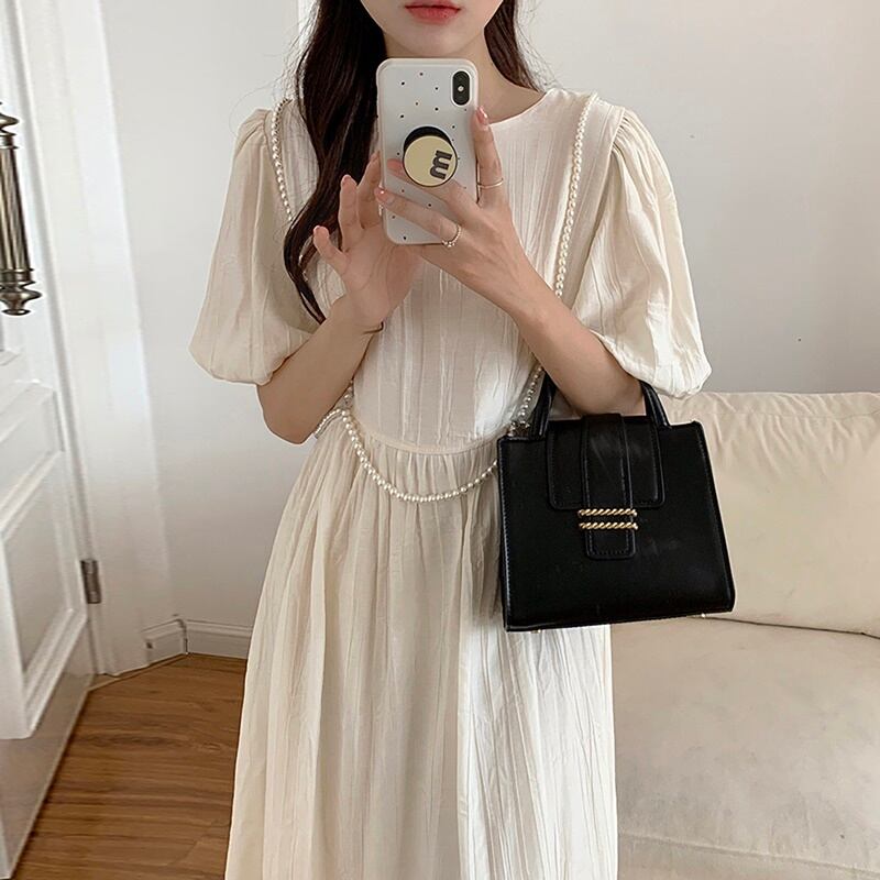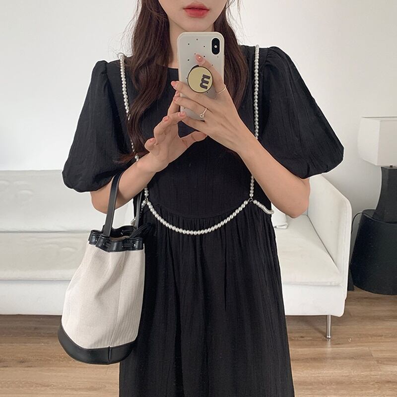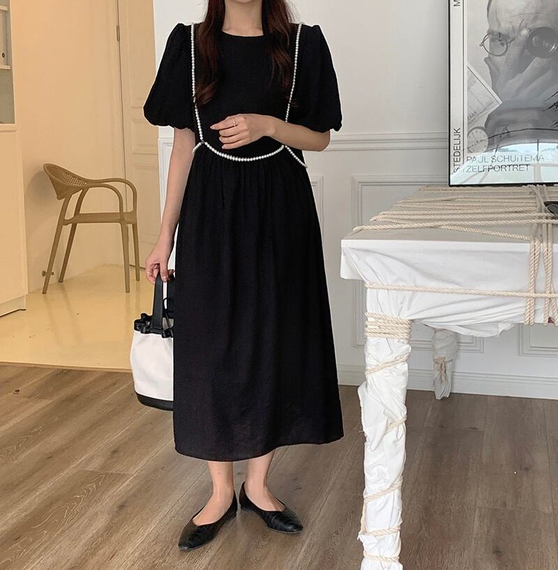 2カラー ハイウエスト ラウンドネック 半袖 ワンピース *on350