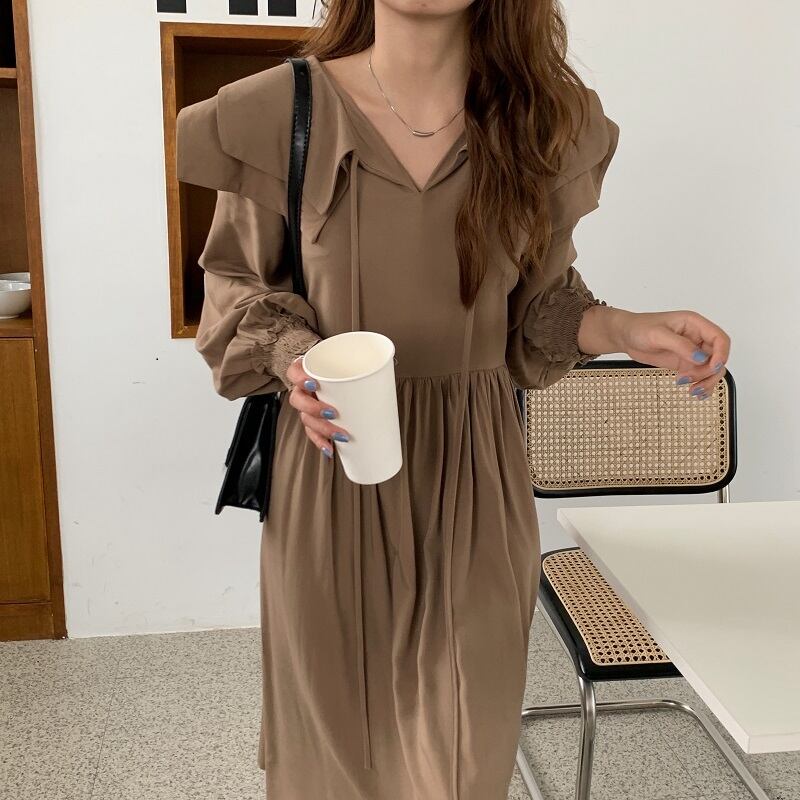 肩のフリルが印象的な長袖ワンピースです。