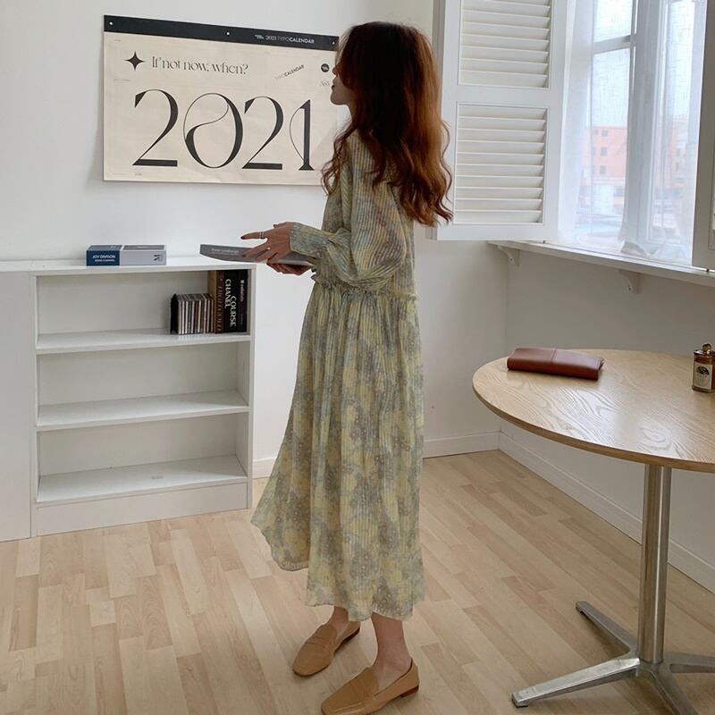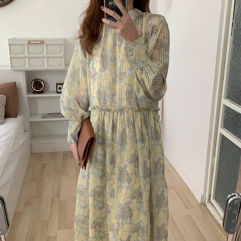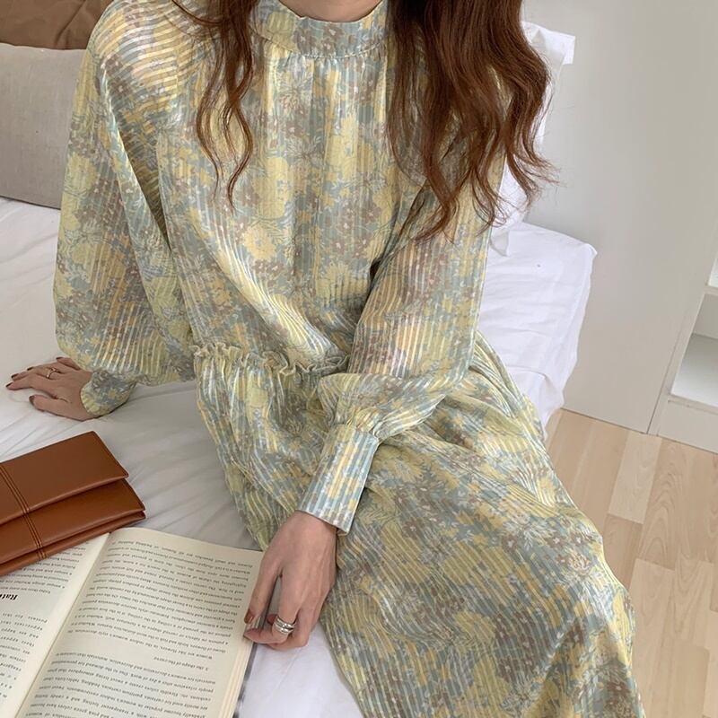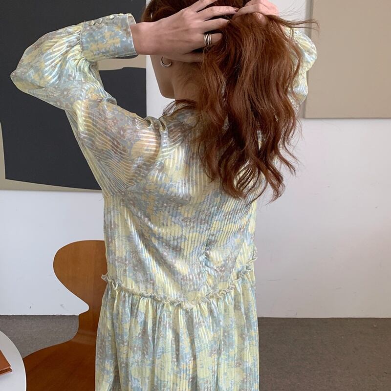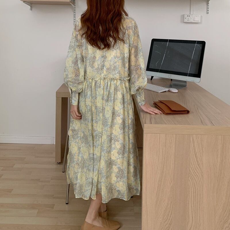 花柄 ボーダー シフォン 長袖 ワンピース *on360
