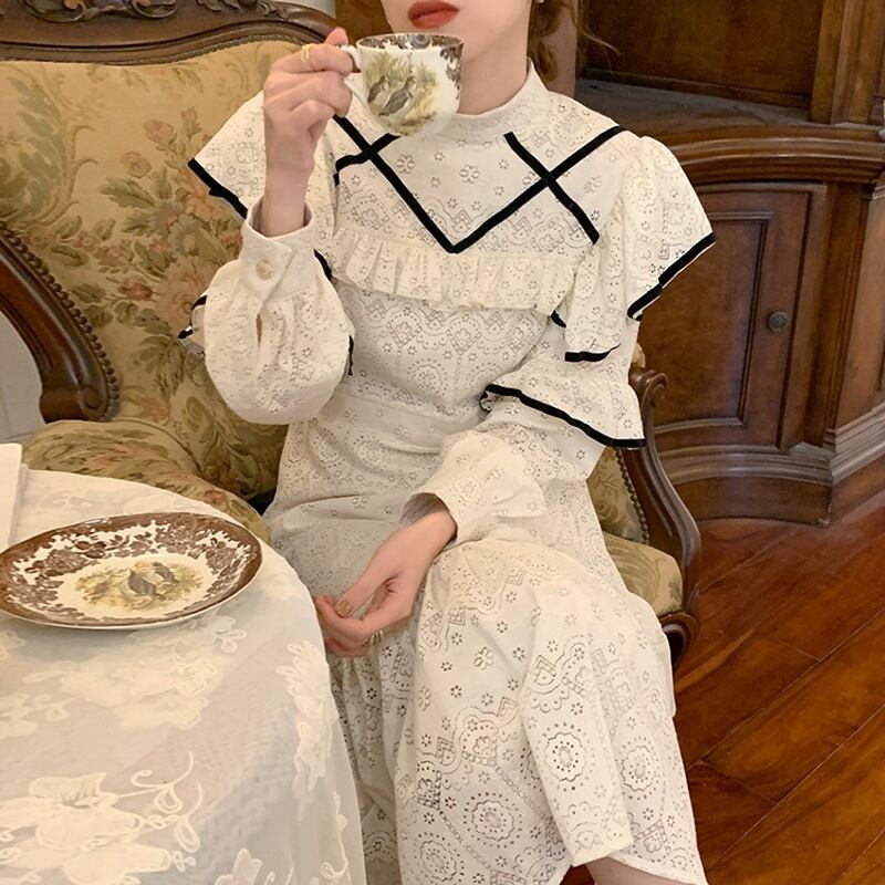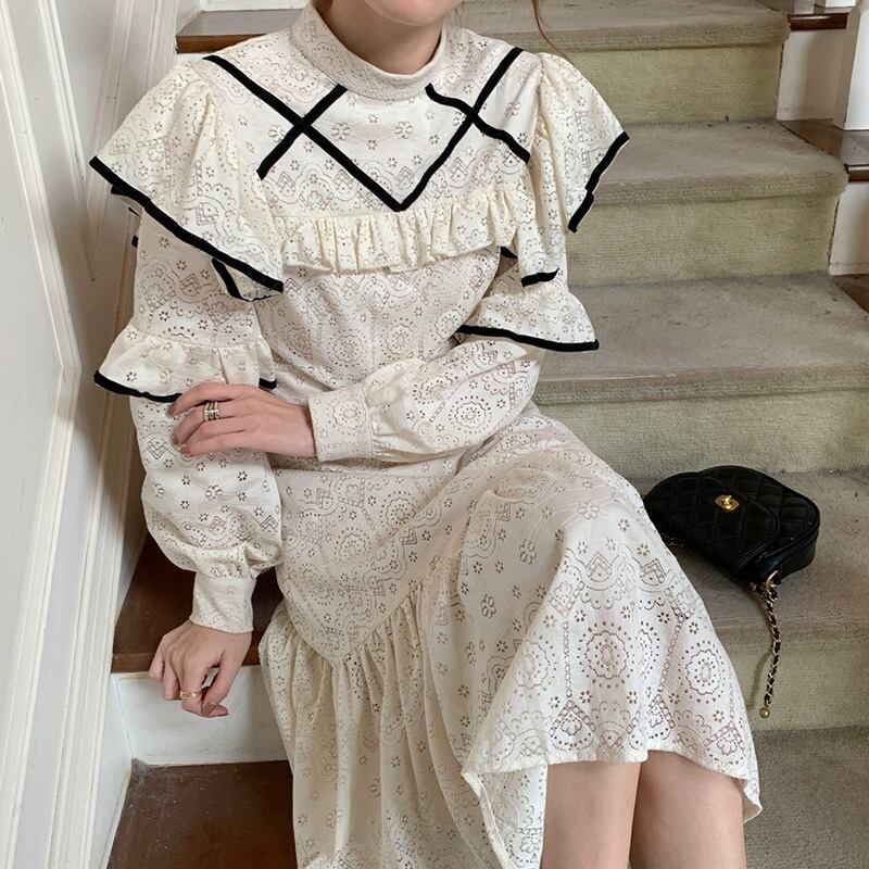 レース フリル ハイネック 長袖 ドレス ワンピース *on361