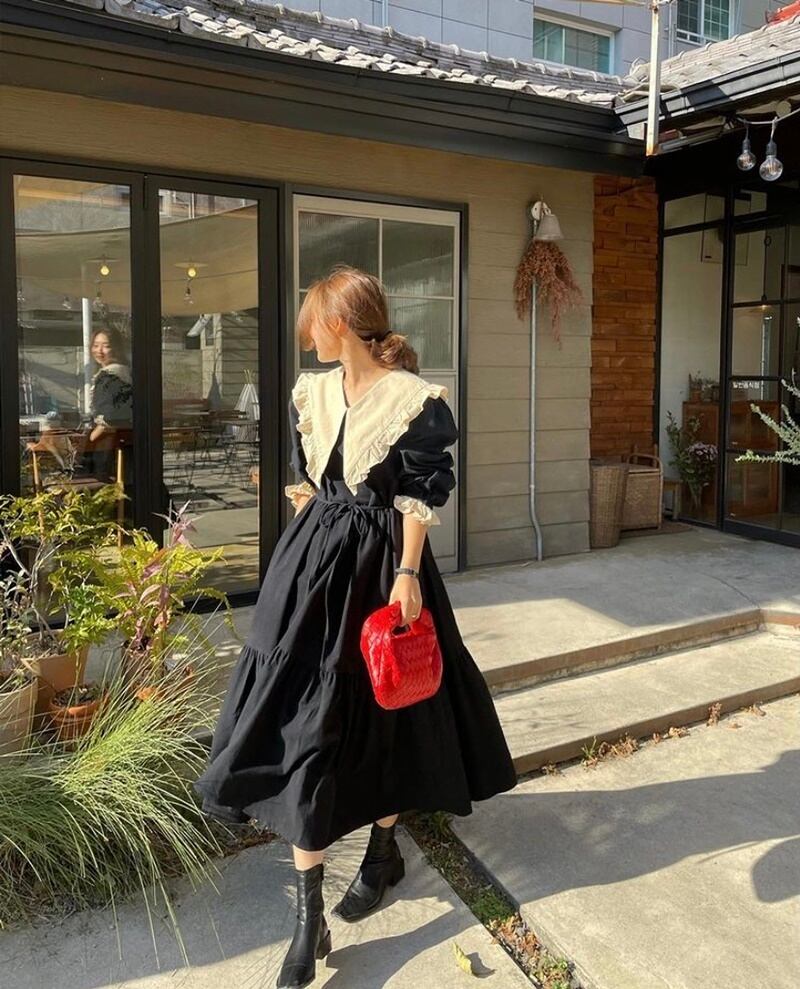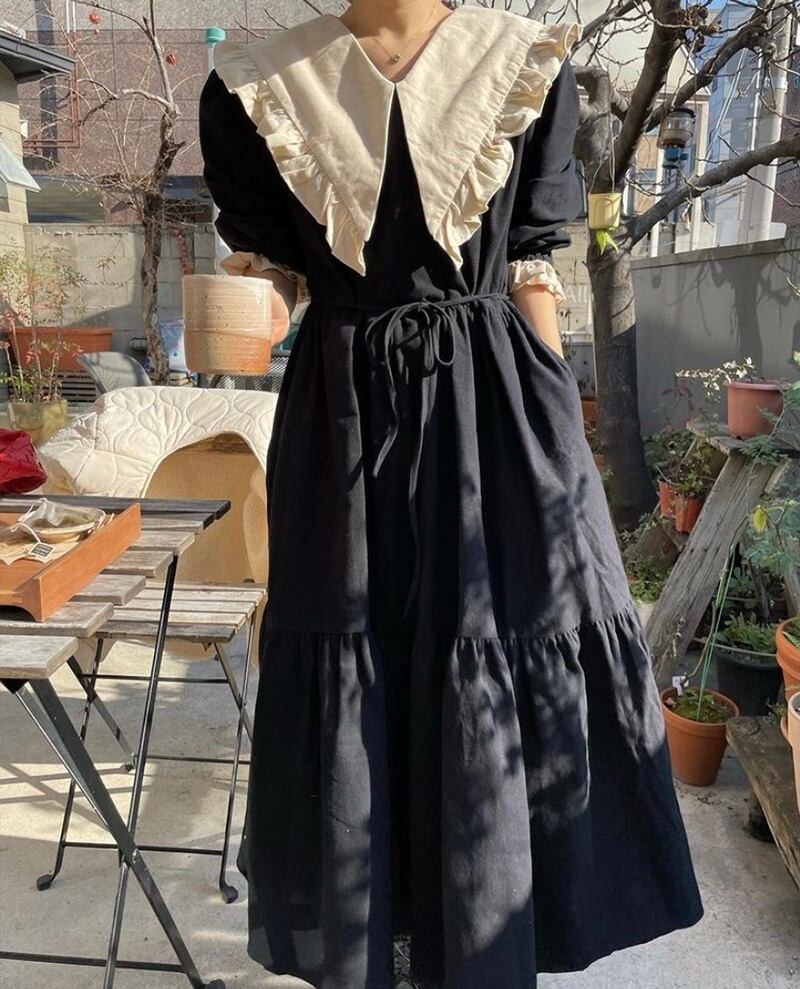 大きな襟が特徴のの長袖ワンピースです。